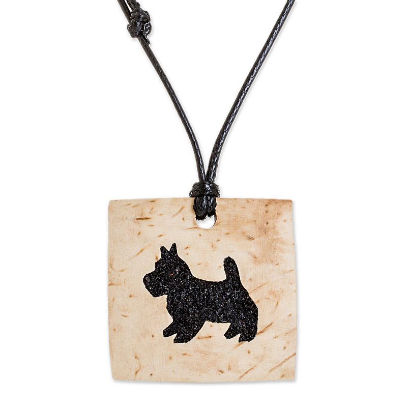 Delivery EstimateHand-carved from a square piece of coconut shell, the image of a Schnauzer pup decorates the pendant of this necklace from Guatemala. Artisans Fernando and David fill the cutaway section with lava stone and resin for a beautiful contrast. The pendant centers an adjustable length of nylon cord.