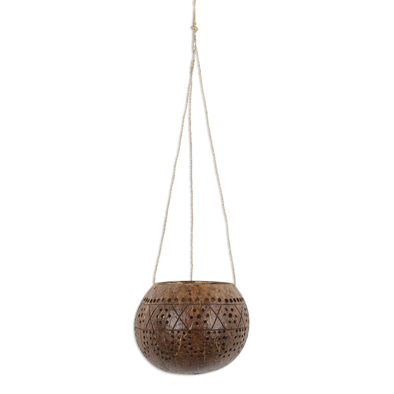 This delightful coconut shell hanging planter meticulously carved by hand in Bali is sure to turn heads in any thriving garden. With its intricate openwork accents, this enchanting accessory designed by Sindhu Nata exudes a serene and whimsical aura. Equipped with an agel grass cord for easy hanging, this beauty will transform any outdoor space into a mesmerizing haven.