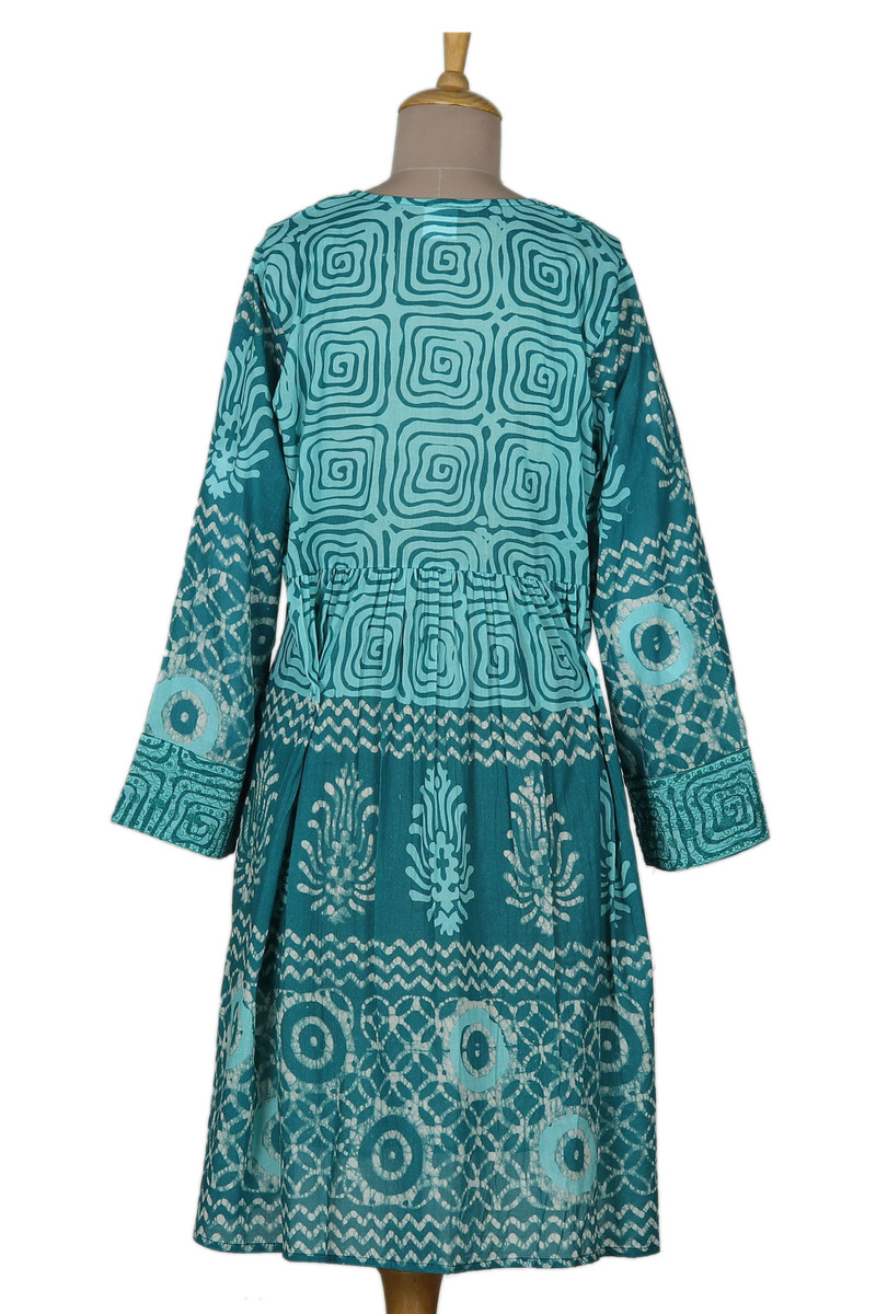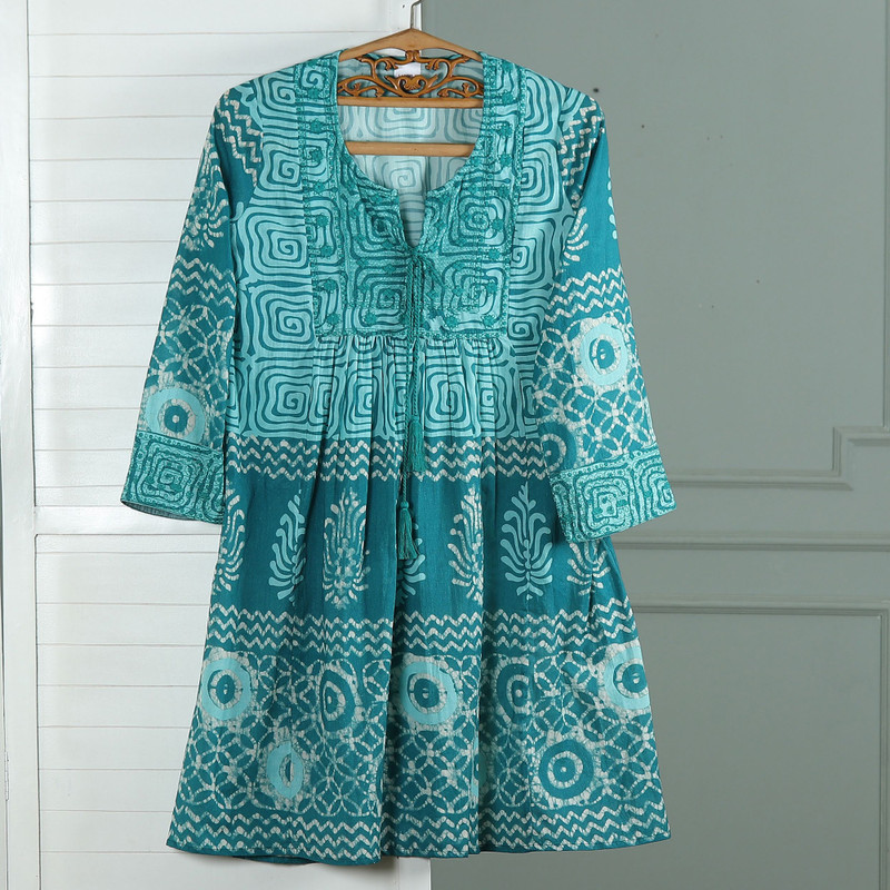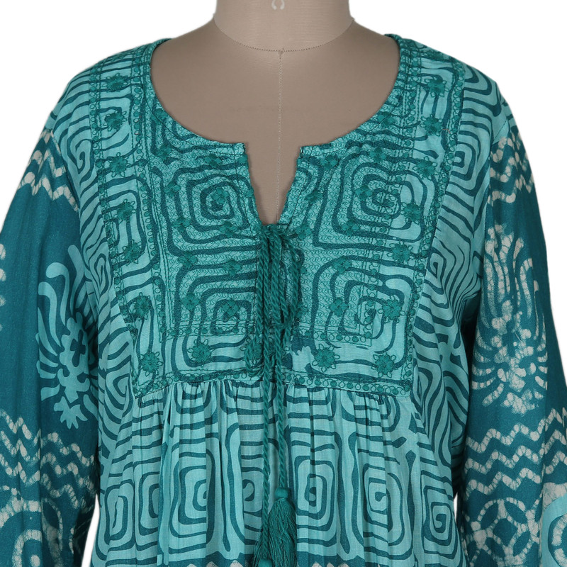 Perfect for spring days and warm summer nights alike, Anchal Ahuja's fun and flirty dress is sure to become your new favorite. Crafted from 100% cotton, the knee-length dress features a block-print pattern, embroidered yoke with two tassels, and long, slightly belled sleeves with embroidered cuffs.