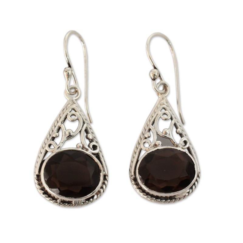 Mysterious smoky quartz casts its spell in these dangle earrings from Neeru Goel in India. Faceted gemstones totaling a sumptuous 10 carats are set in polished sterling silver with a rope-style edge. Traditional jalistyle openwork in silver crowns the gems. The earrings dangle from sterling silver hooks.