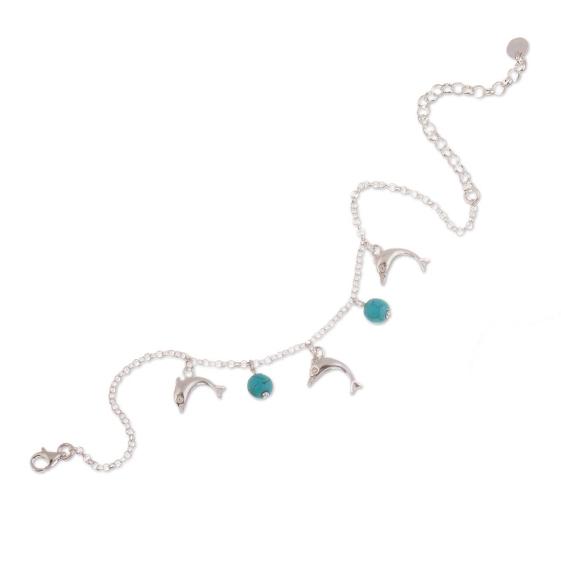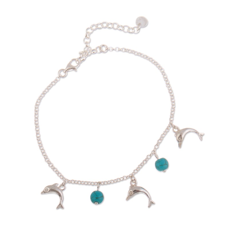 The sea's magic charm will protect your days with a touch of style, all thanks to Nancy Quispe's newest design. The Peruvian artisan works with sterling silver to create this charm bracelet, accented with reconstituted turquoise gems and cute dolphins that dance together with ethereal beauty.