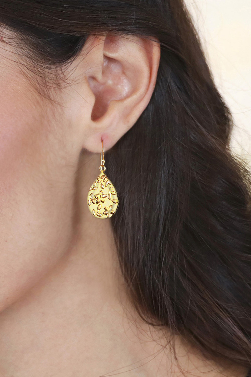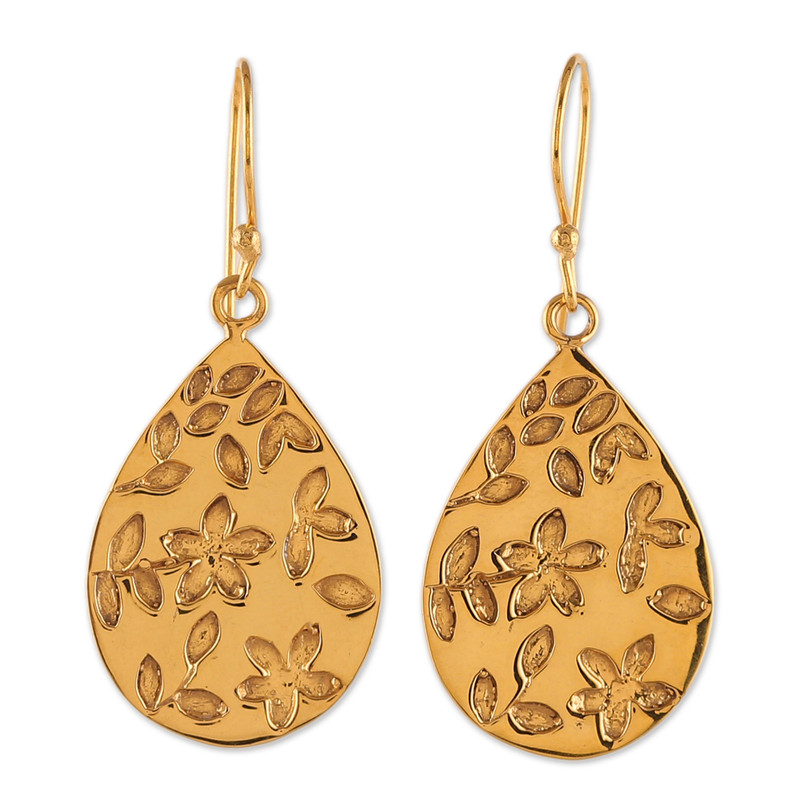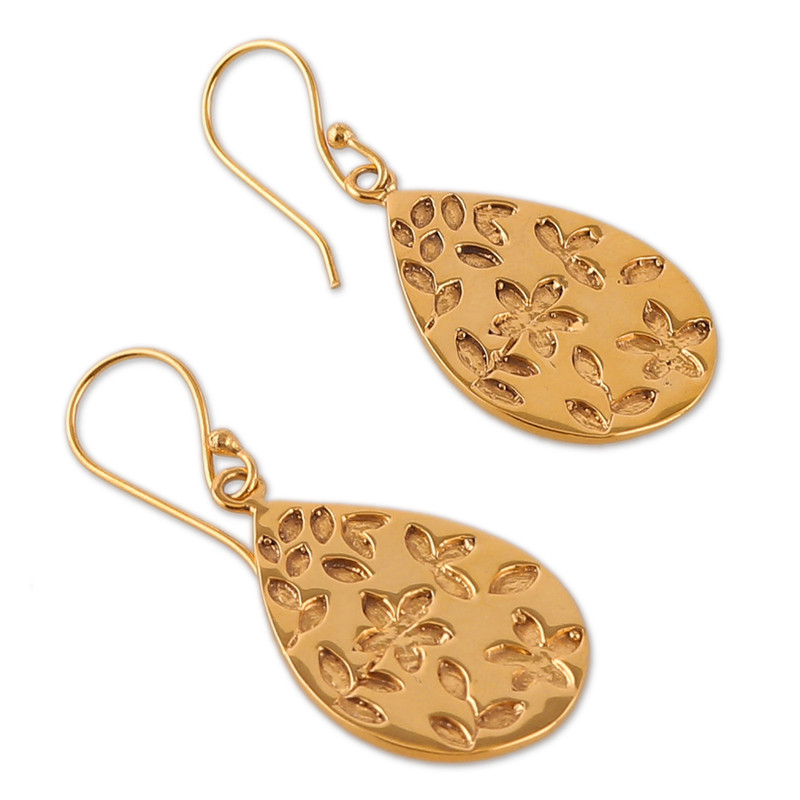 Charming drops cradle spring's beauty in their interior, allowing you to fill your ensembles with a graceful essence. Designer Ritu Malpani and a talented Indian team create these dangle earrings from brass, adding tiny floral motifs for a sweet look.
