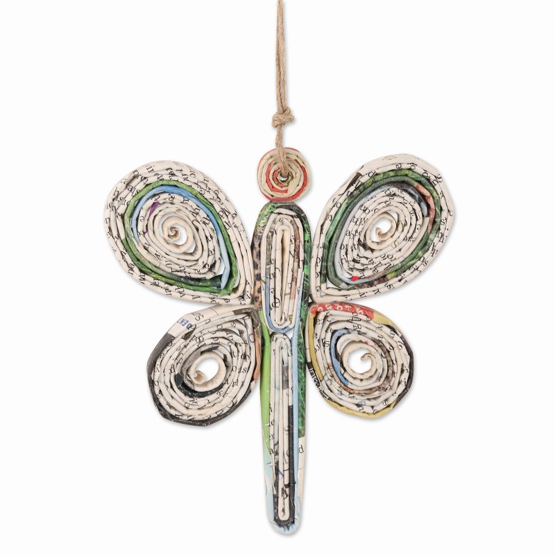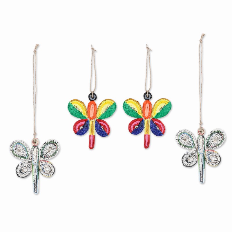 Have an eco-friendly holiday this year with Yusra's dragonfly ornaments, which are crafted entirely from recycled paper. First, the Indian artisan cuts the paper into strips of all different sizes, then rolls the strips into coiled shapes. Two ornaments receive a coat of colorful paint, while the remaining two are left plain. Each ornament is equipped with a jute string for hanging.