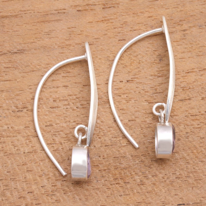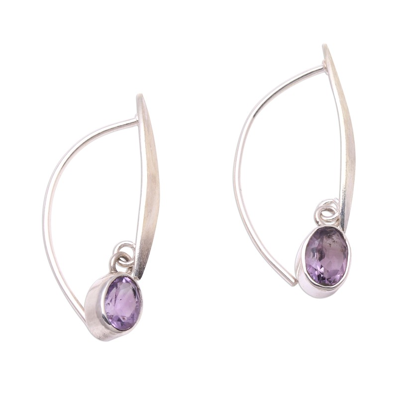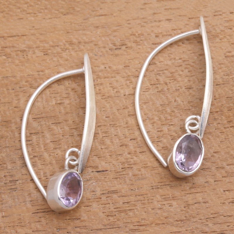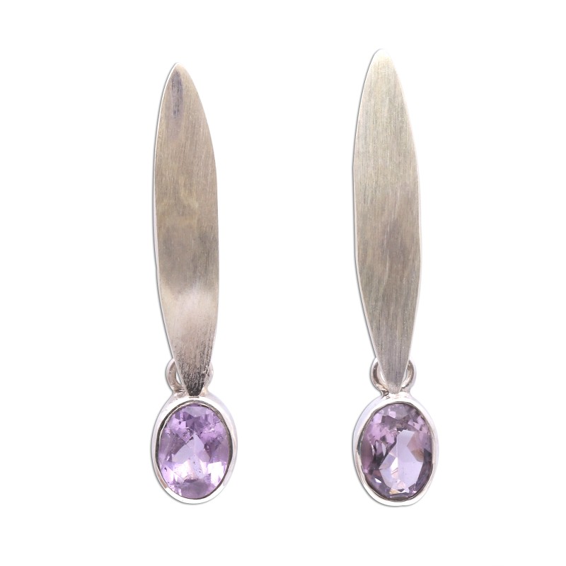 Below brushed-satin sterling silver ellipses, faceted amethyst ovals dangle elegantly. Balinese artisan Budiharta designs these earrings, which adorn the ears on long sterling hooks.
