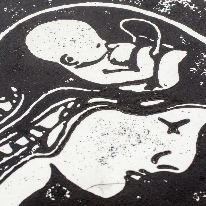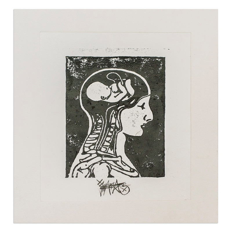 A side portrait of a human is depicted as if it were an MRI or X-ray image. We get to see the intricate bone structure as well as a fetus in the stage of development that replaces the brain. Guatemalan artist Spencer Samayoa says of his striking xylograph print in black and white: "This artwork is inspired by how the images that are formed in our brain are our own personal interpretations that give birth to the conception of an idea."