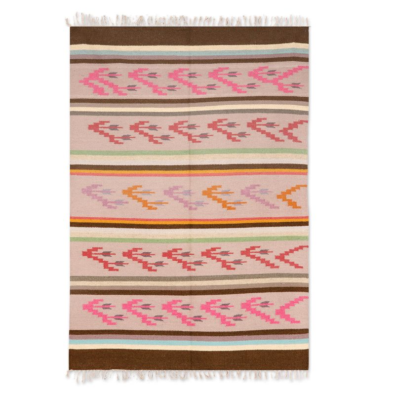 Against a background of petal pink, geometric blossoms dance. Sonik Sethi presents this Indian area rug, which is handwoven from wool and accented with striped patterns. Fringe work accentuates the ends of the flatweave rug.