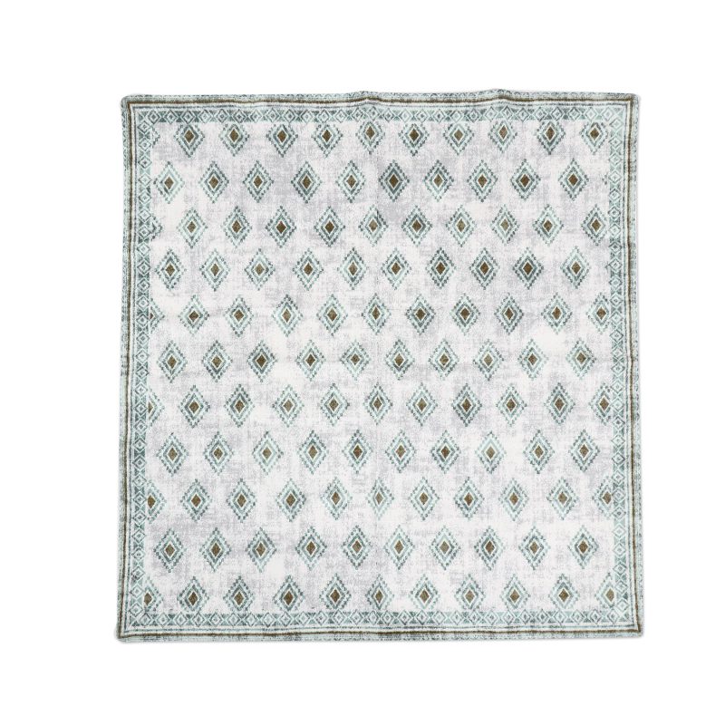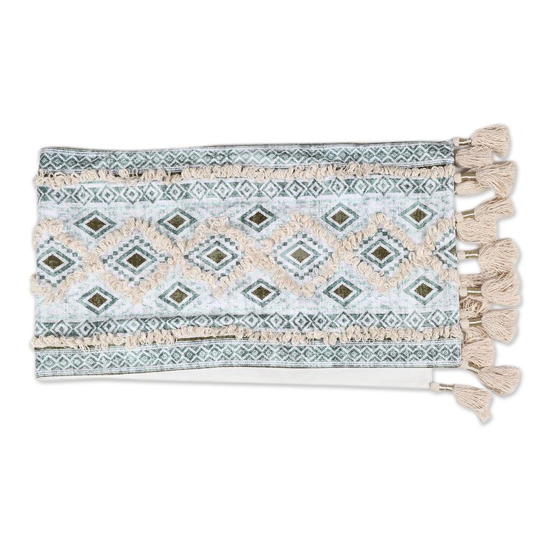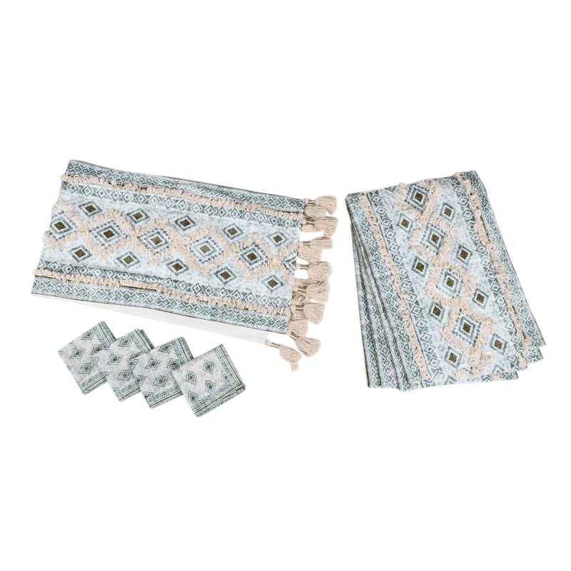Coordinate your kitchen with this charming set of table linens from India's Seema. Crafted from 100% cotton, the set includes a table runner, four napkins, and four placements printed with a geometric diamond pattern. The artist embellishes the table runner and placemats with tufted cotton embroidery and ivory-colored fringe.