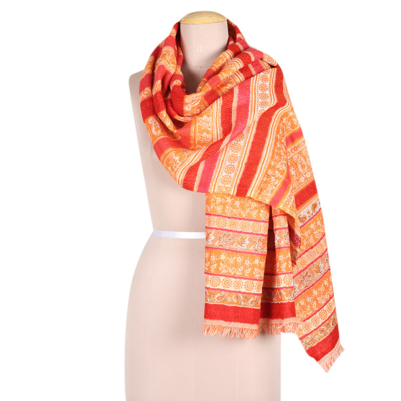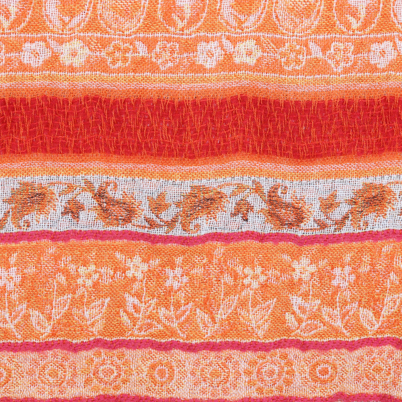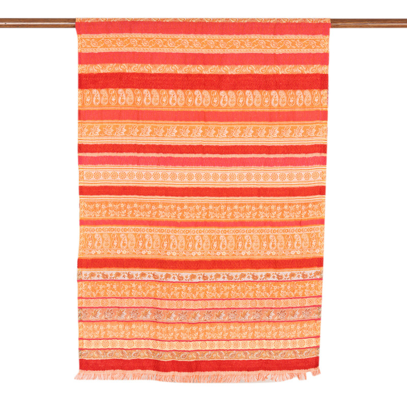 Winter will never be dull again if you add a pop of color to your outfits with this vibrant striped shawl in flaming red and orange as the main colors. Woven from wool with the jacquard technique, the fringed shawl features paisley, floral, leaf and sun motifs in a dreamy design by India's Shahid.