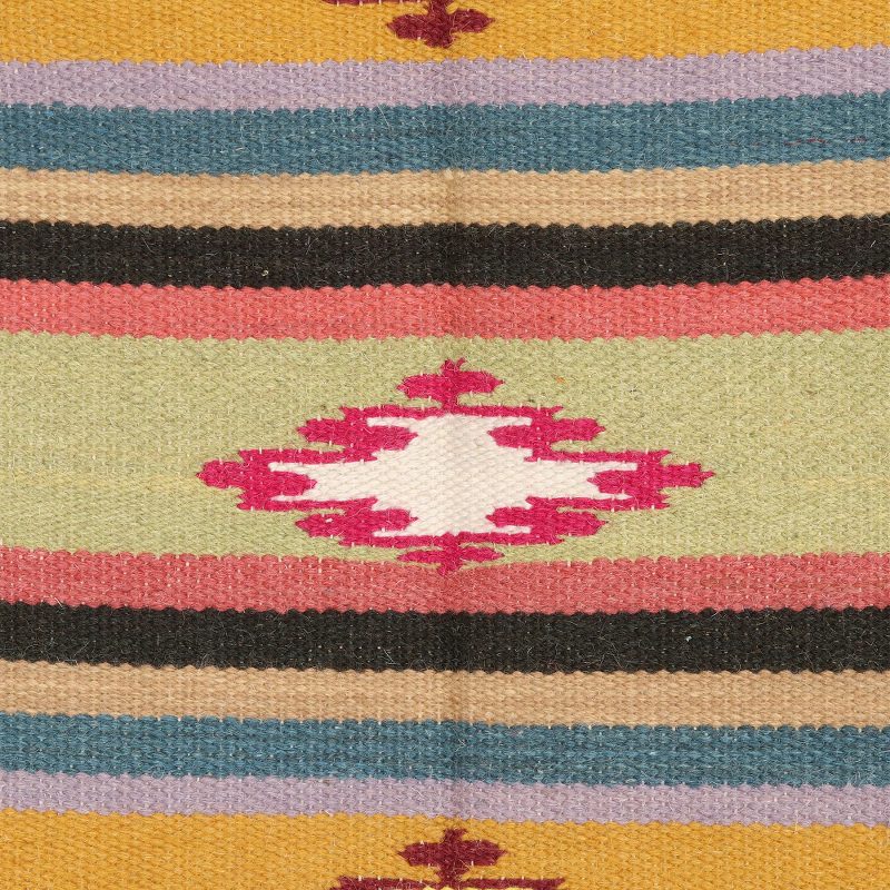 Inspired by the stars in the skies, Indian artisans create this fabulous area rug. They work on a traditional hand loom, weaving this rug from wool to feature geometric diamond patterns against colorful stripes. A petite fringe accents each end of the flatweave rug.