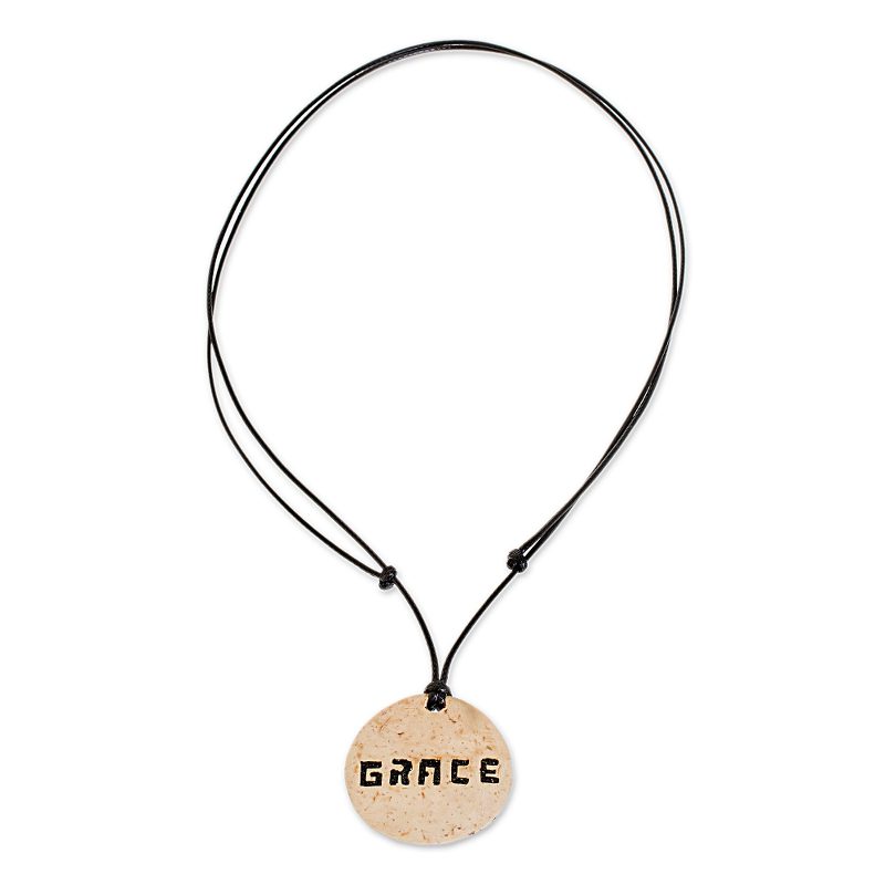 Working with a circular piece of coconut shell, Guatemalan artisans Fernando and David create this inspirational pendant necklace. Within the coconut shell pendant, the word "Grace" is carved and filled with lava stone and resin for a striking contrast. The pendant centers an adjustable length of black nylon cord.