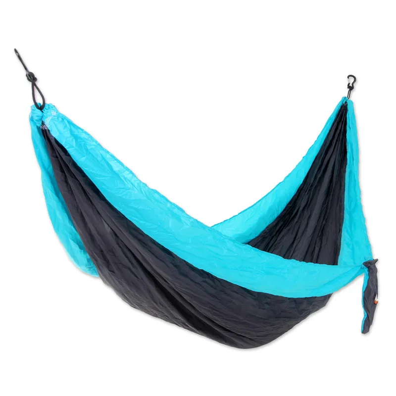 In dark grey framed by turquoise, this parachute hammock from Ticket To The Moon is ideal for every occasion, whether it is traveling, spending a day in the park, or just staying home. Play, relax, take your everyday nap or sleep in your hammock! The hammock is made of high-grade nylon parachute silk, which adjusts to the body, offering a comfortable sleep and ideal protection from rocky, wet, or sloping terrain, as well as from insects and small reptiles. This hammock is lightweight, strong, foldable, and sets up in less than a minute. Originally created by Ticket To The Moon and tested in all climates around the world since 1996, the camping hammock is made by travelers for travelers.