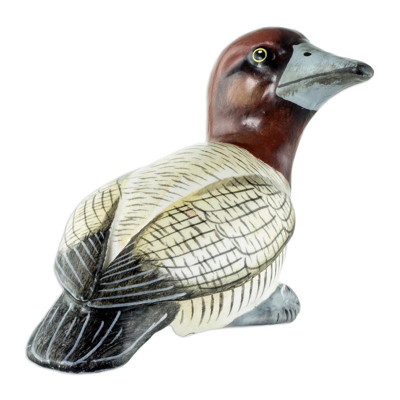 Flaunting beautiful russet brown plumage, the canvasback duck is a beautiful bird. During the breeding season, his head and breast turn red. Mauricio Morales depicts the bird in a ceramic sculpture and carefully paints it by hand before protecting the colors with a coat of wax. The realistic figurine is signed and identified by the artist.