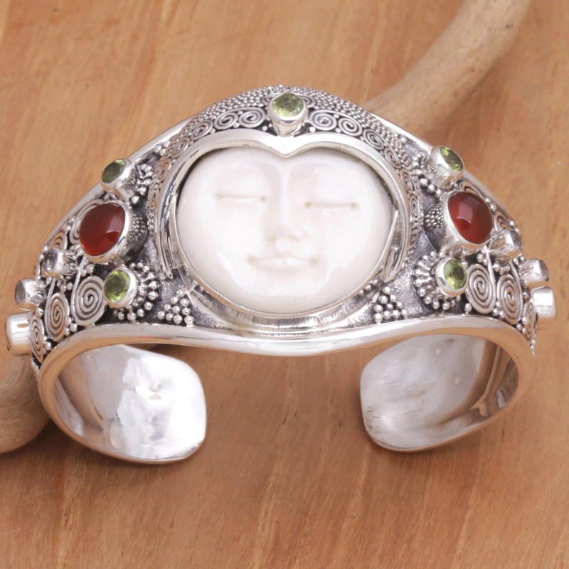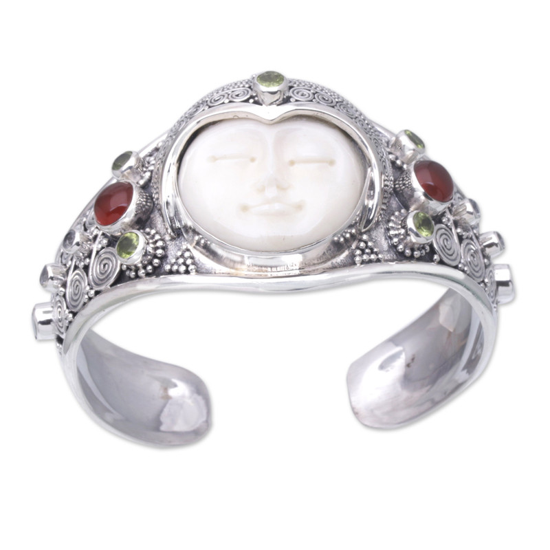 Serenely beautiful, the milky face of the moon appears to glow from within. Buana of Bali presents this beautiful cuff bracelet, crafted from sterling silver and set with a cameo of hand-carved cow bone. The bracelet is further embellished with precious carnelian, blue topaz, and peridot stones totaling over 2.5 carats.