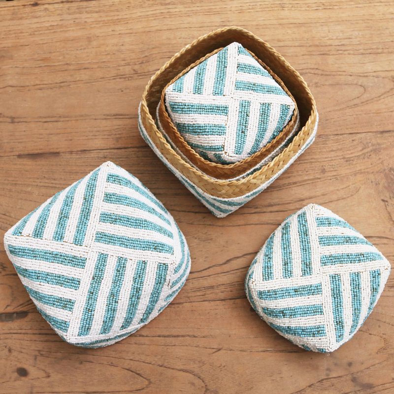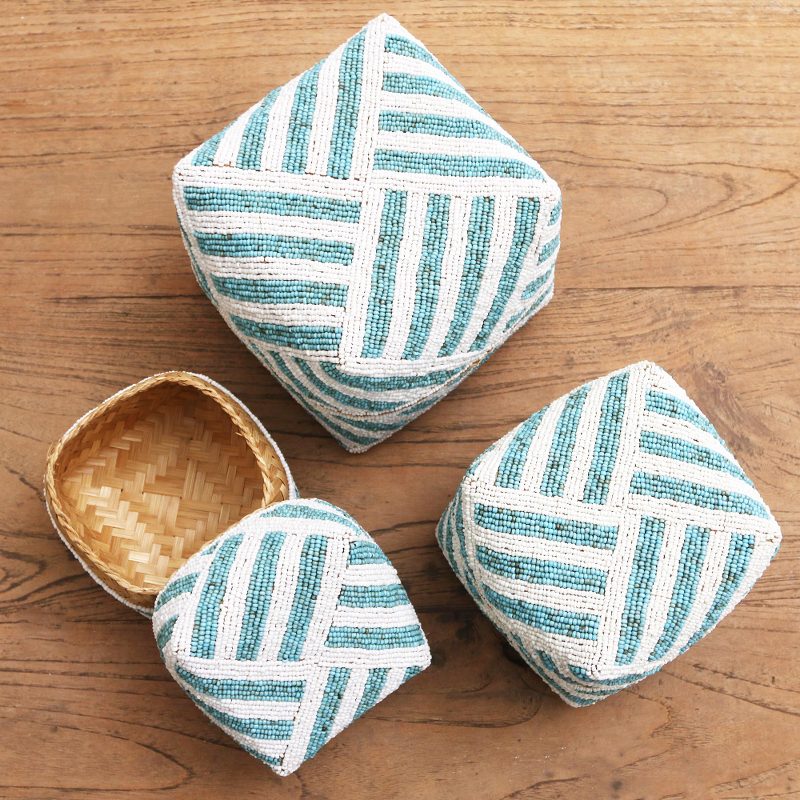Although Kadek Casa's set of keben can be used for decor and storage, these prayer boxes traditionally serve as receptacles for offerings to the gods. The Balinese artisan hand carves each box from bamboo, embellishing the lids with plastic beads in a pretty striped pattern.