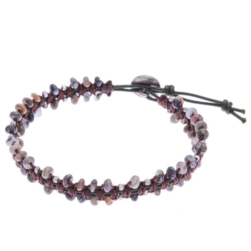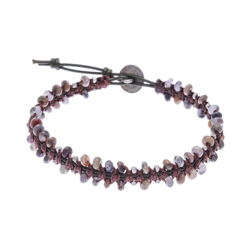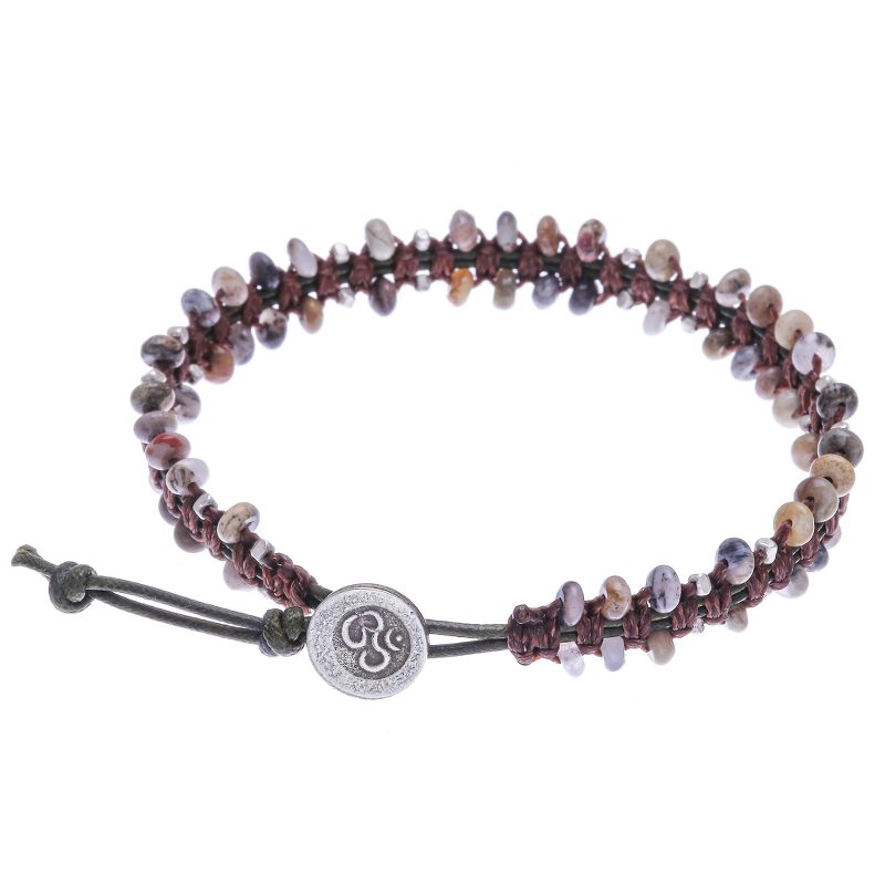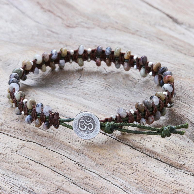 Tend to your spiritual side with the help of this bracelet designed by Thailand's Siriporn. The artisan uses macrame techniques to hand-knot multicolored agate gemstone and brown polyester cord around a strong leather cord. The bracelet fastens with an adjustable 950 Karen silver button clasp stamped with the om symbol.