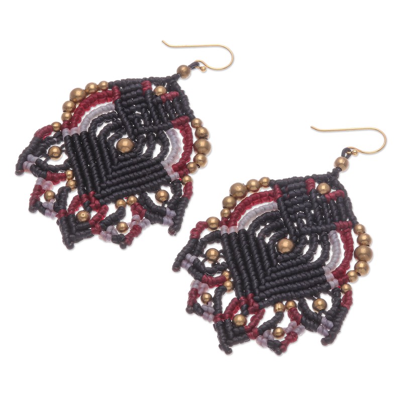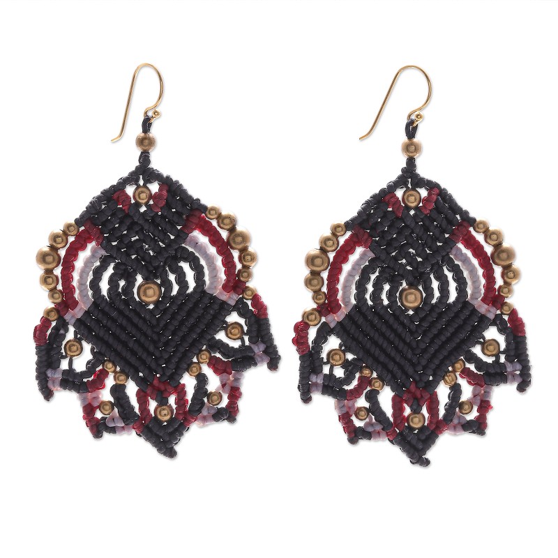 Bohemian girls will fall in love with these funky dangle earrings, which are hand crafted with traditional macrame techniques. Thai artisan Kanjana uses waxed polyester cord to hand knot the earrings, accenting the pair with shimmering brass beads and 18k gold-plated sterling silver hooks.