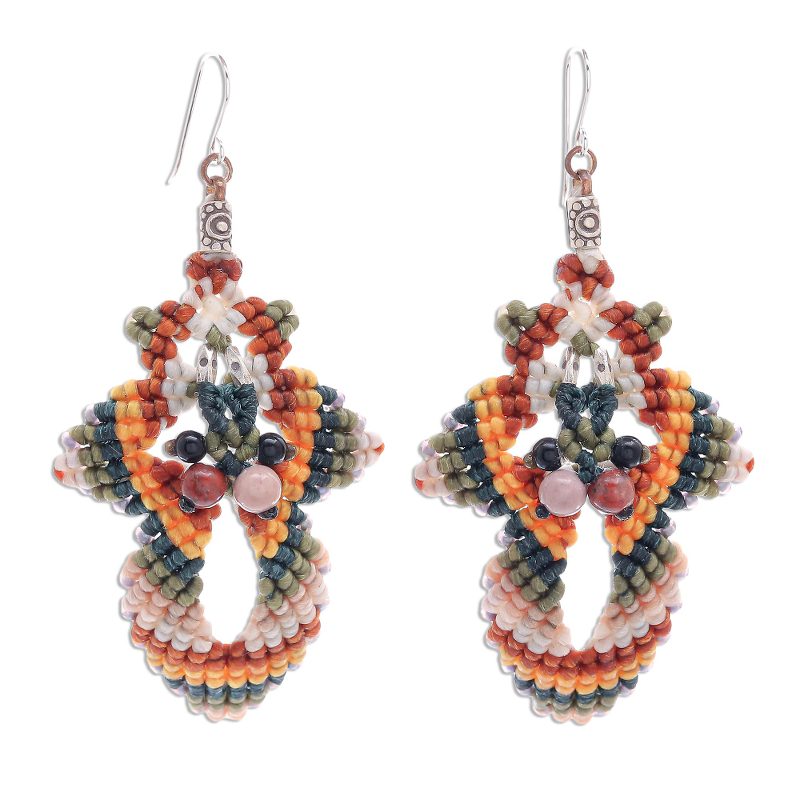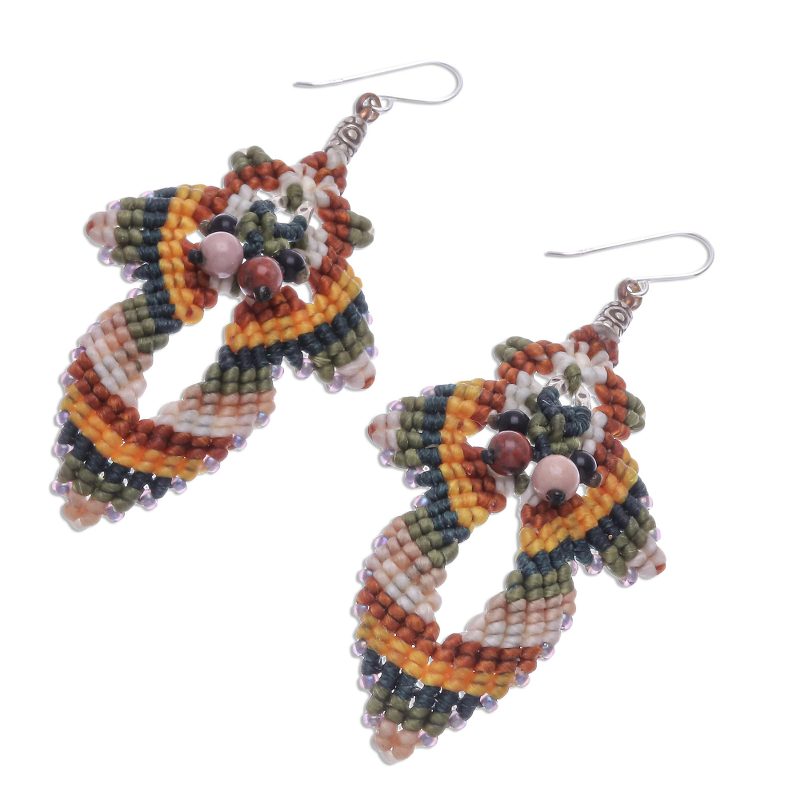 Slip these earrings on first thing in the morning and your watch your day unfold into a wonderful adventure. Each macrame earring is hand knotted from green, yellow, brown, and cream polyester cord, and finished with shining jasper and onyx gemstones in the center. Purple glass beads accentuate these earrings, which swing from sterling silver hooks.