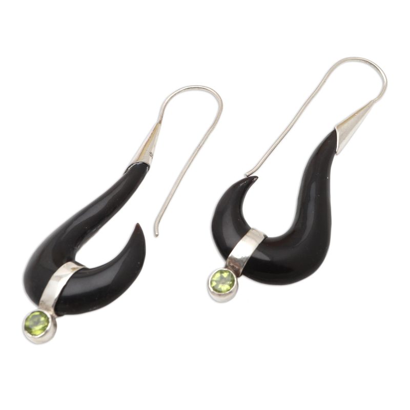 Bali's Made Wardika uses peridot stone on his lovely dangle earrings to give them elegance. The artisan hand carves a wide hook from black bone to create the earrings, adding a faceted peridot gem that twinkles in the light. Sterling silver accents add a touch of shine to the pretty pair.