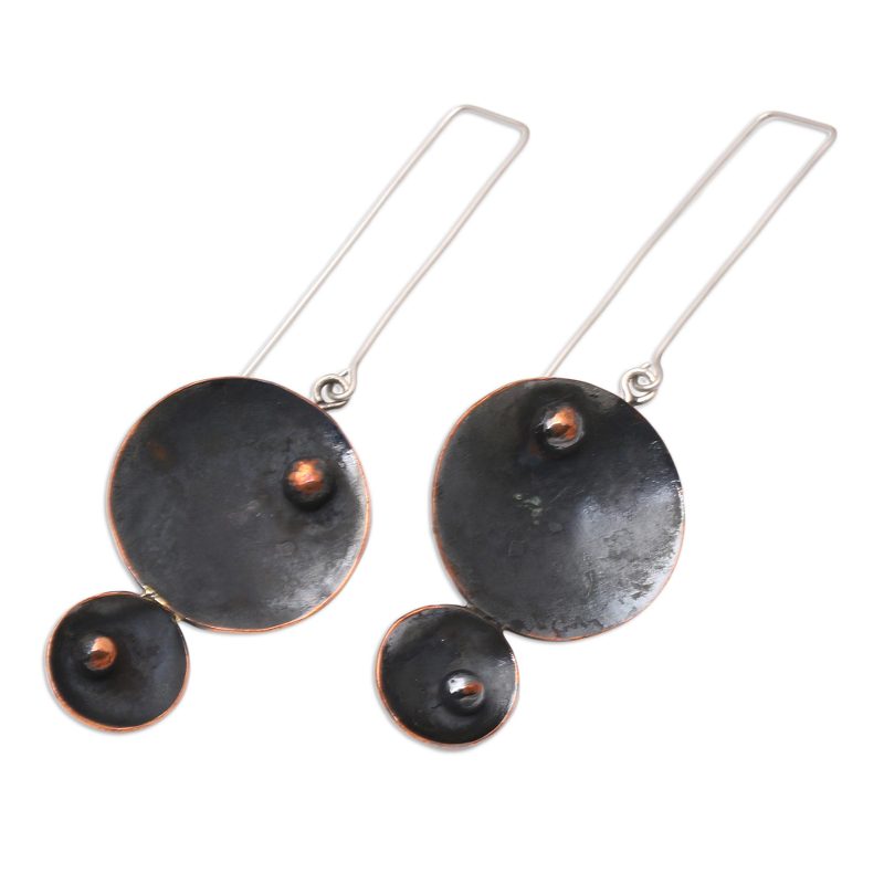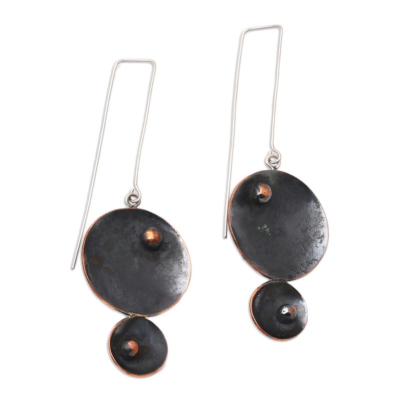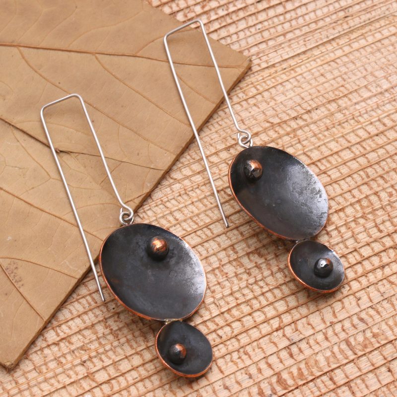 Agus Suryanto in Java designs a pair of dangle earrings that are equal parts fun and elegant. He links two concave circles in different sizes, with the larger above the smaller. Contrasting with the dark, oxidized surfaces, small globes of polished cooper add interest. They hang on stainless steel hooks.