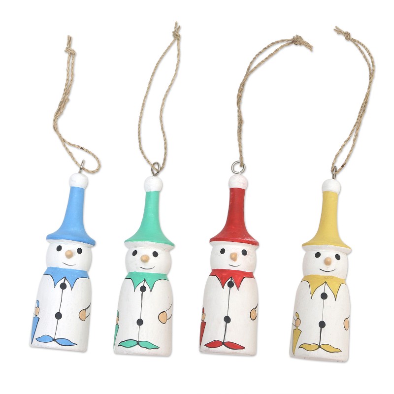 Designed by Komang Sulaksana in Bali, these sweet snowmen will add handcrafted charm to your Christmas tree. The four ornaments are carved from native albesia wood and painted carefully by hand in assorted colors.