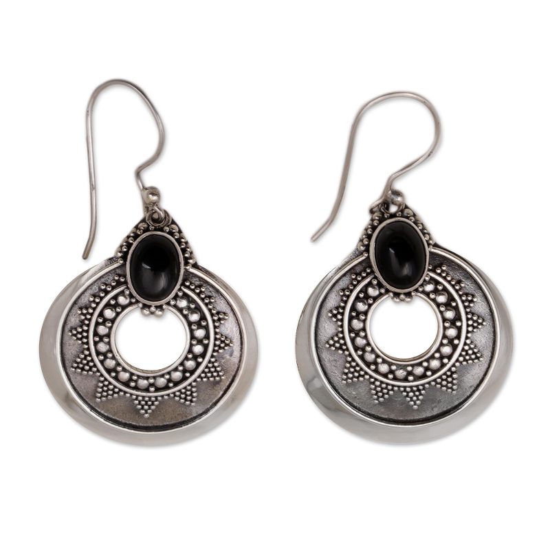 Engraved with Indonesian design motifs, argent circles evoke ancient medallions. Onyx adorns these regal earrings. Sukartini's design is crafted of sterling silver and natural stones.