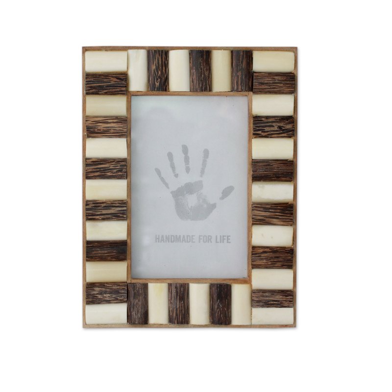 Kamal has many beautifully crafted picture frames. This one with contrasting strips of natural water buffalo bone and teakwood has a distinctive masculine feel. It's perfect for a cherished picture of our teenage Godson's graduation picture.