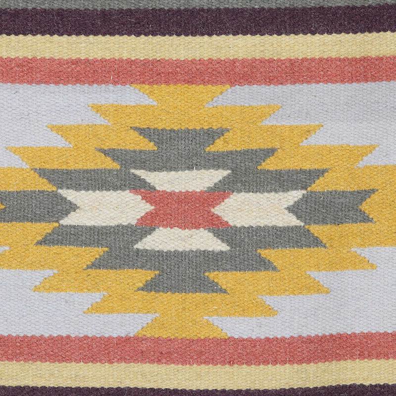 Tender and cheerful colors embellish the geometric motifs of this area rug presented by Sonik Sethi. Handloomed by Indian artisans, this wonderful item is made from wool, with playful fringes at the ends for a unique accent.