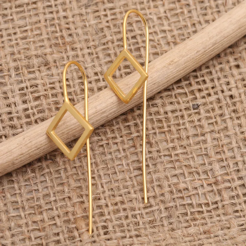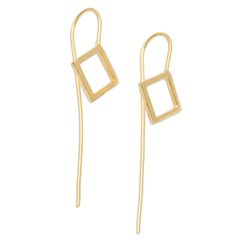 Desi Antari in Bali designs a pair of earrings intended to give you effortless glamour. The artisan crafts the earrings from 18k gold-plated sterling silver in an openwork diamond shape, which glistens at the end of a long, gold-plated hook.