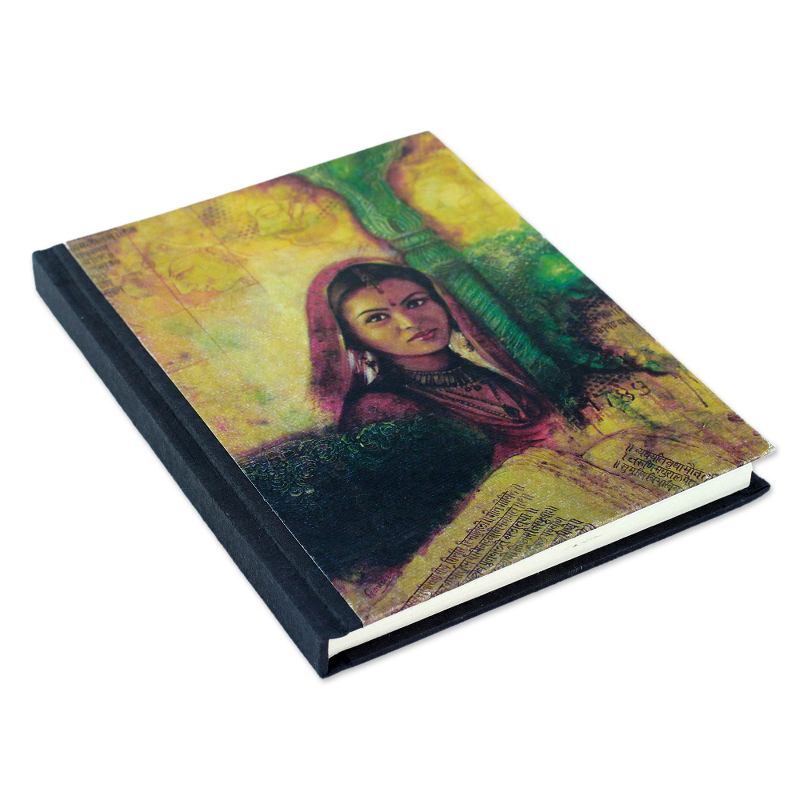 The portrait of a beautiful Mughal graces the hard cover of this journal from Asha Prabha. Underscored by images from the past, she is surrounded by ancient Sanskrit scriptures in a detailed screen printed composition. The journal is crafted with handmade paper featuring 50 pages.