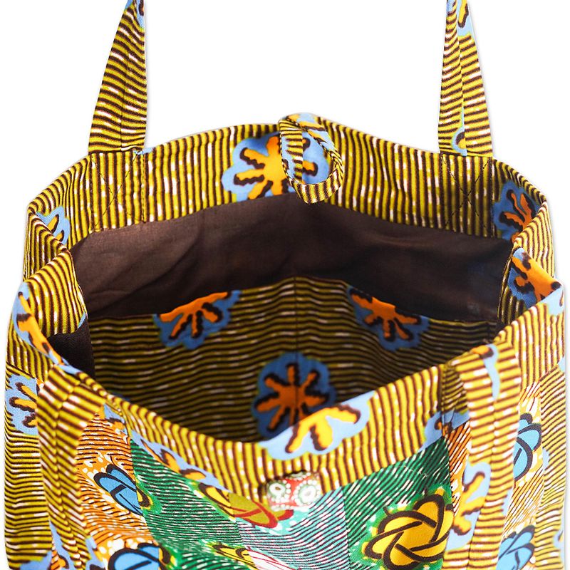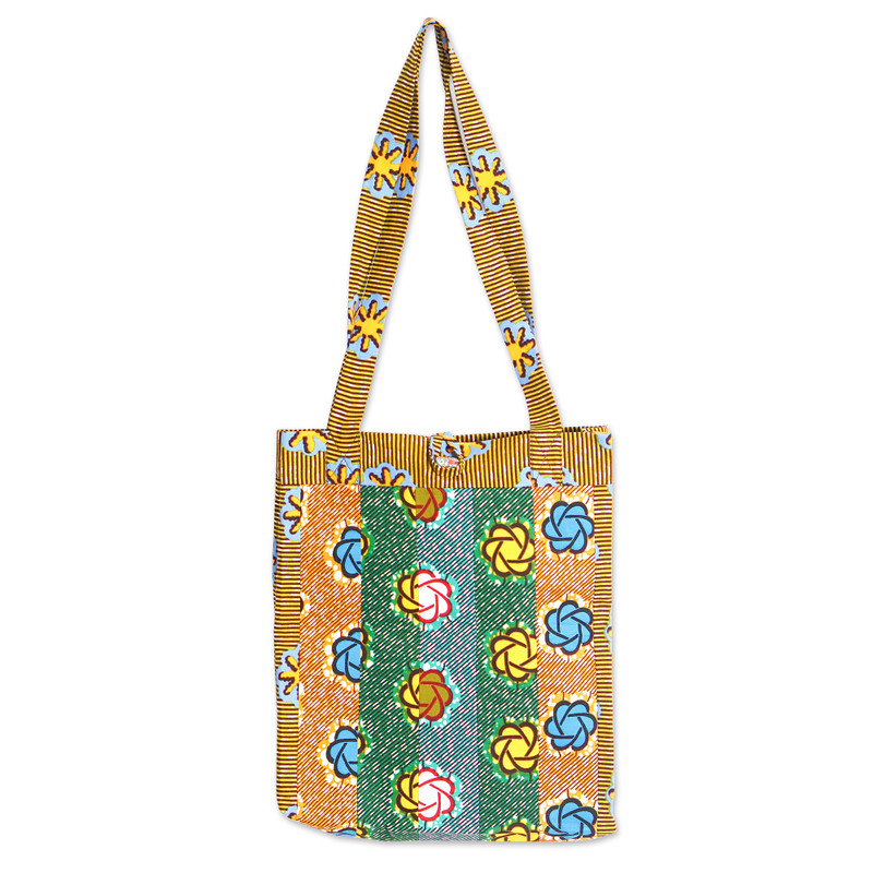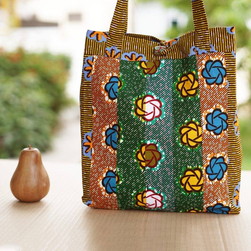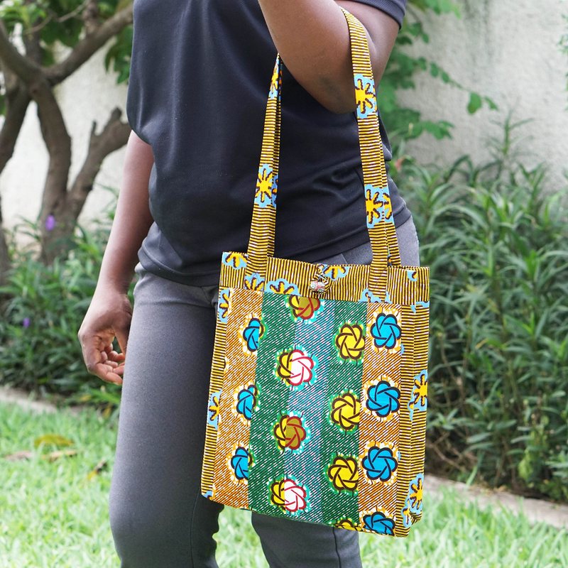 Green, yellow and blue hues converge in a chic creation by Hannah Dodoo. Equipped with a recycled glass bead working as a button closure, this cotton tote bag features a traditional Ghanaian pattern evoking the region's unique spirit. On top of that, its lightweight design is complemented by comfortable straps and interior pockets.