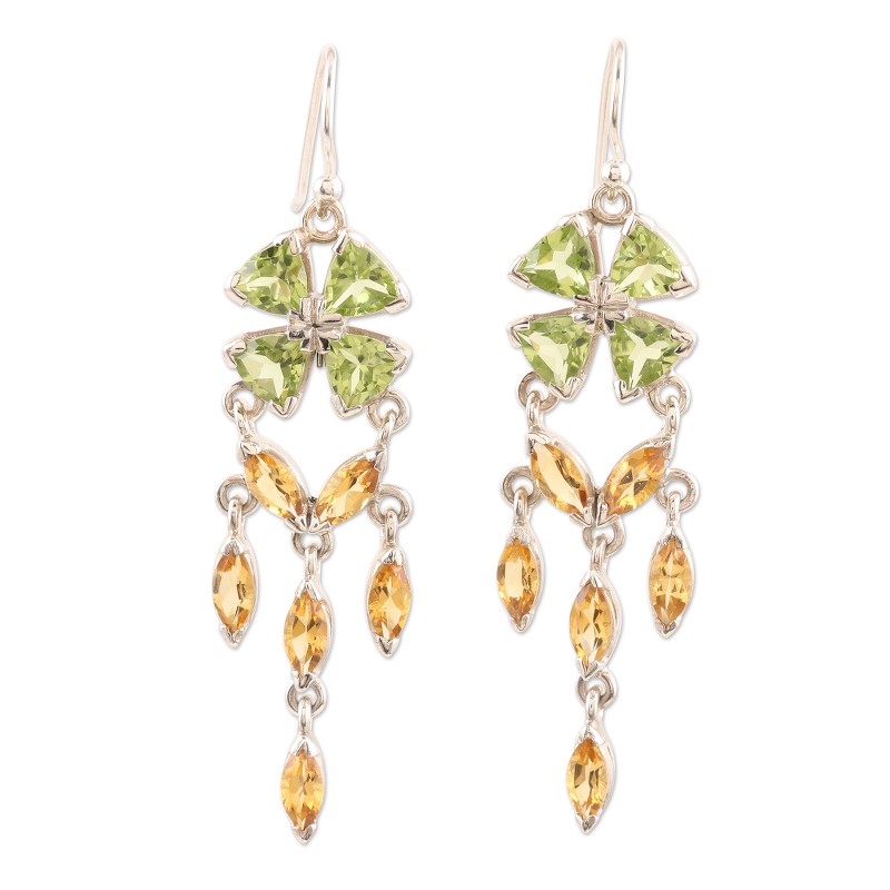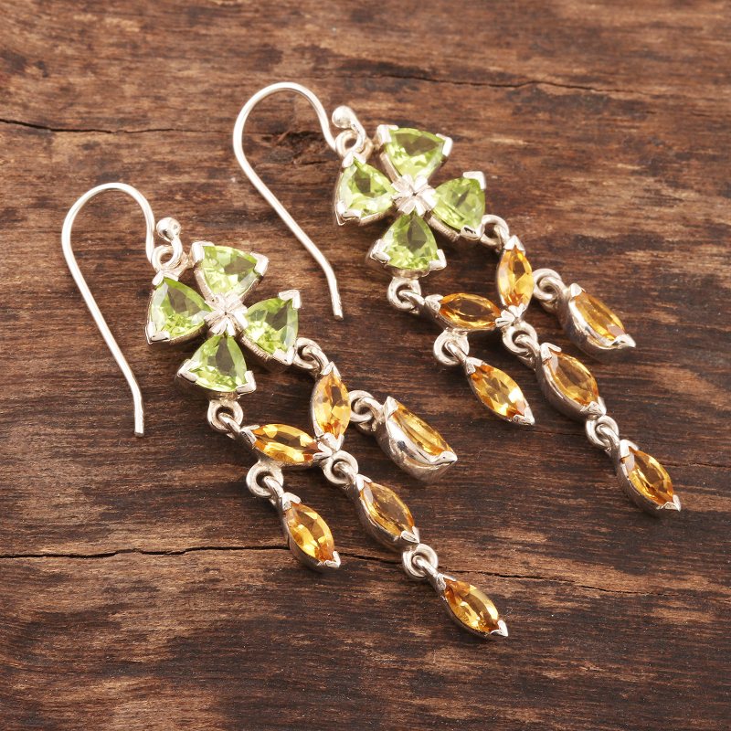 Four triangle-shaped peridot gemstones in prong settings form a shimmering green flower in these dangle earrings designed by India's Shubhra Singh. A series of marquise-shaped citrine gemstones hang beneath the flower, while sterling silver hooks finish the pair.