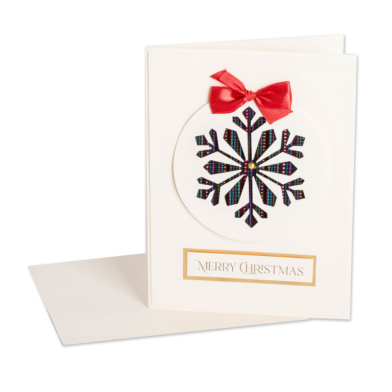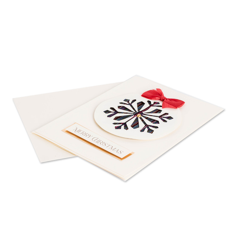 Delivery EstimateGuatemala's Association of Magdalena Women Artists sends their wishes for a tender holiday in this Christmas greeting card. Lustruous paper serves as a canvas, allowing the team to adorn the card with traditional cotton textile accents, a charming snowflake motif and a pretty red ribbon—all saying "Merry Christmas" to you!