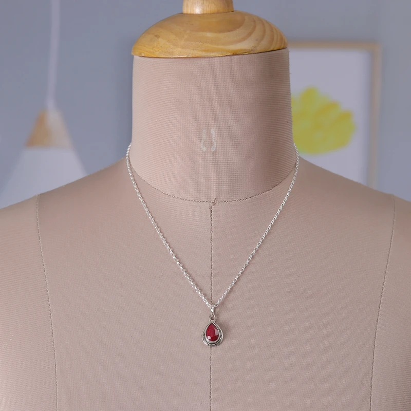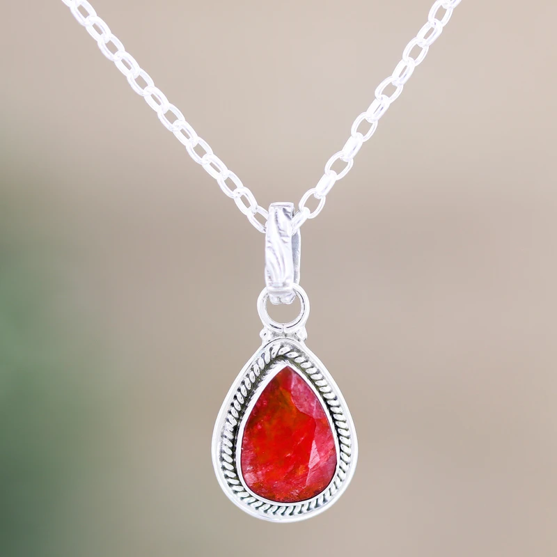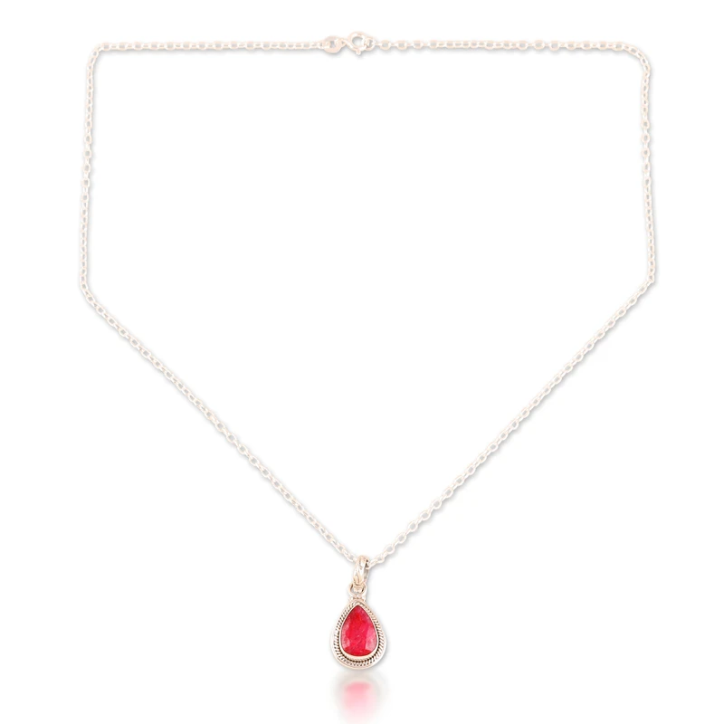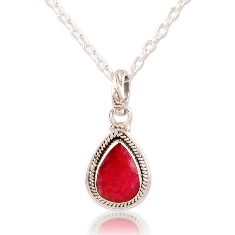 Symbolizing love, passion and success, the ruby on Bhavya Jain's pendant necklace is considered the king of gemstones. The Indian jewelry artist uses sterling silver to handcraft the necklace, centering the pendant with a faceted, pear-shaped gemstone in a bezel setting.