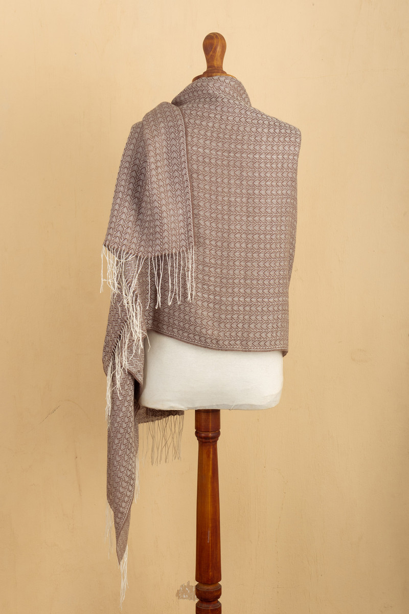 Elegant shades of sepia and ivory blend gracefully into a geometric pattern on this handwoven shawl from Peru. Talented artisans Raquel and Gregor design the shawl using a soft alpaca blend, perfect for a sophisticated look. Long fringes complete the piece with a touch of uniqueness.