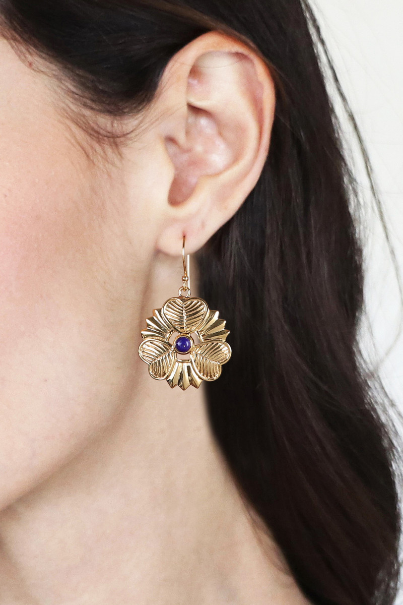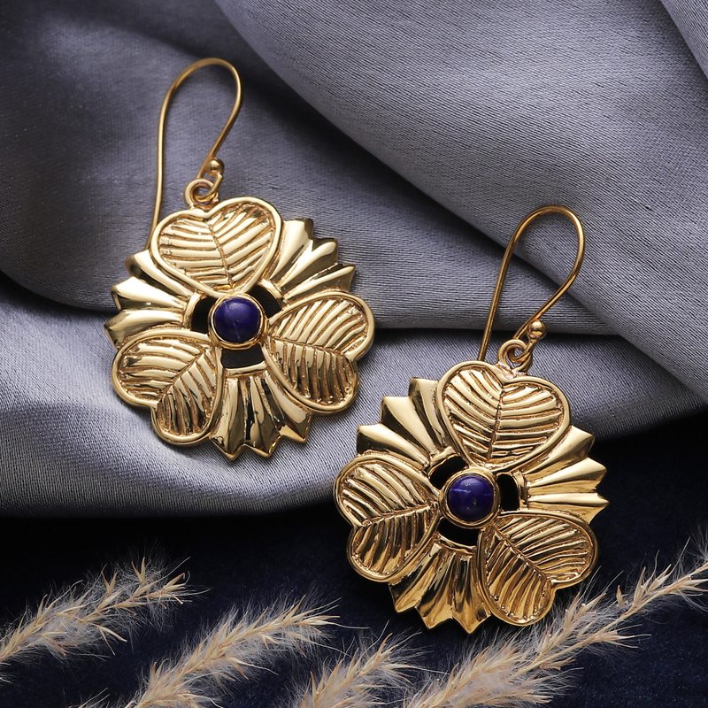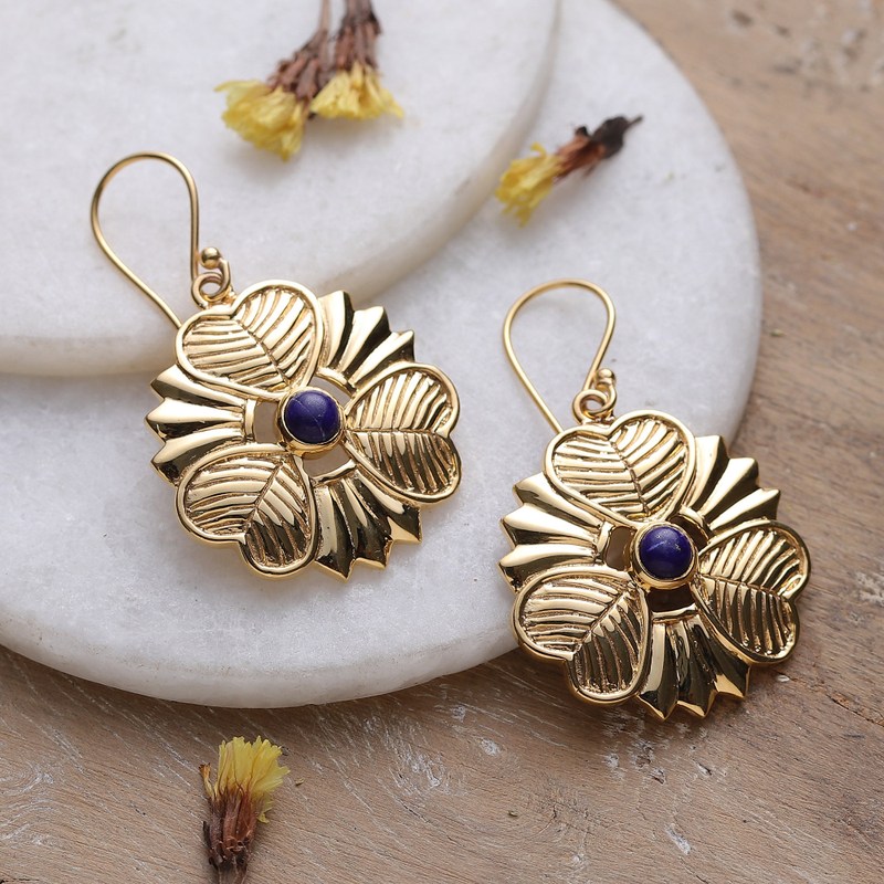 Hearts and flowers crown your beauty with a regal aura of intellect. Characterized by Ritu Malpani's sublime talent, these brass dangle earrings arrive from India to infuse your days with mystic blue light emanating from the lapis lazuli stones that decorate the design.
