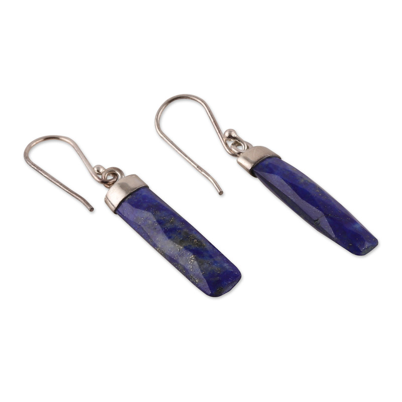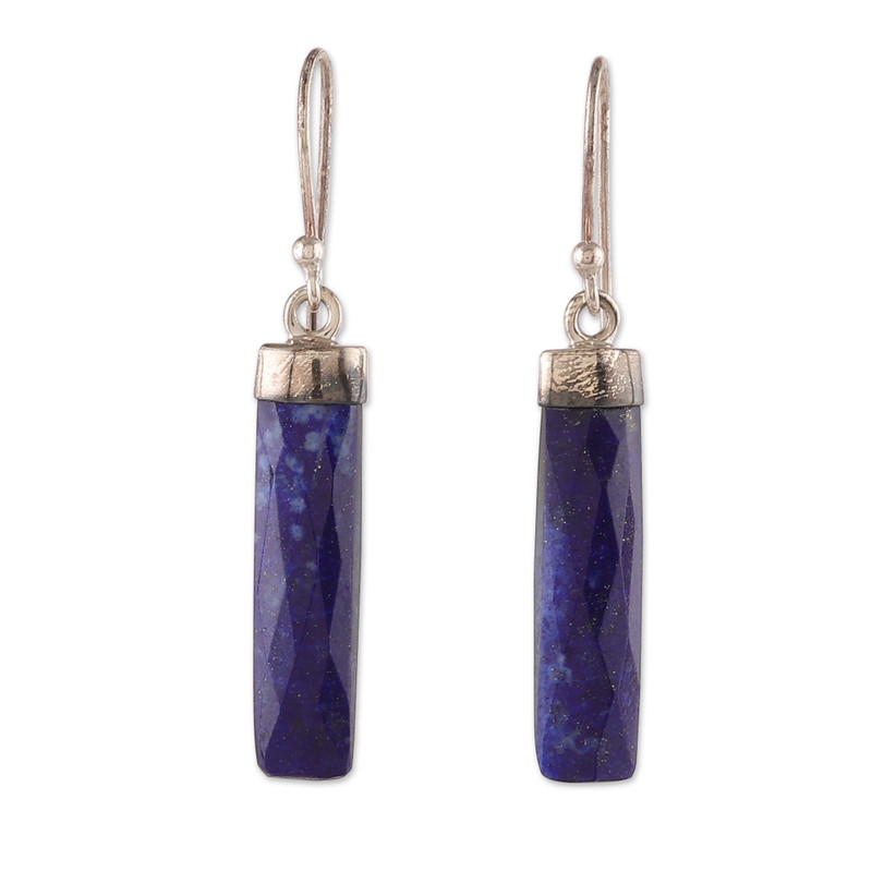 Let intellect and majesty adorn those special occasions with Bhavya Jain's newest design. The artisan—from India—merges modern trends with mysticism to create these minimalist dangle earrings, whose sterling silver structures enchantingly hold faceted lapis lazuli fragments totaling six carats of magical grace.