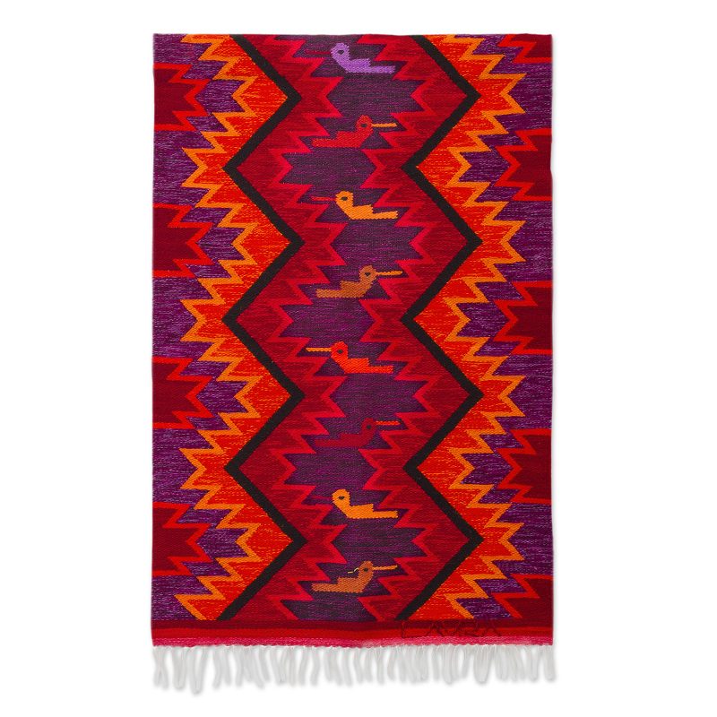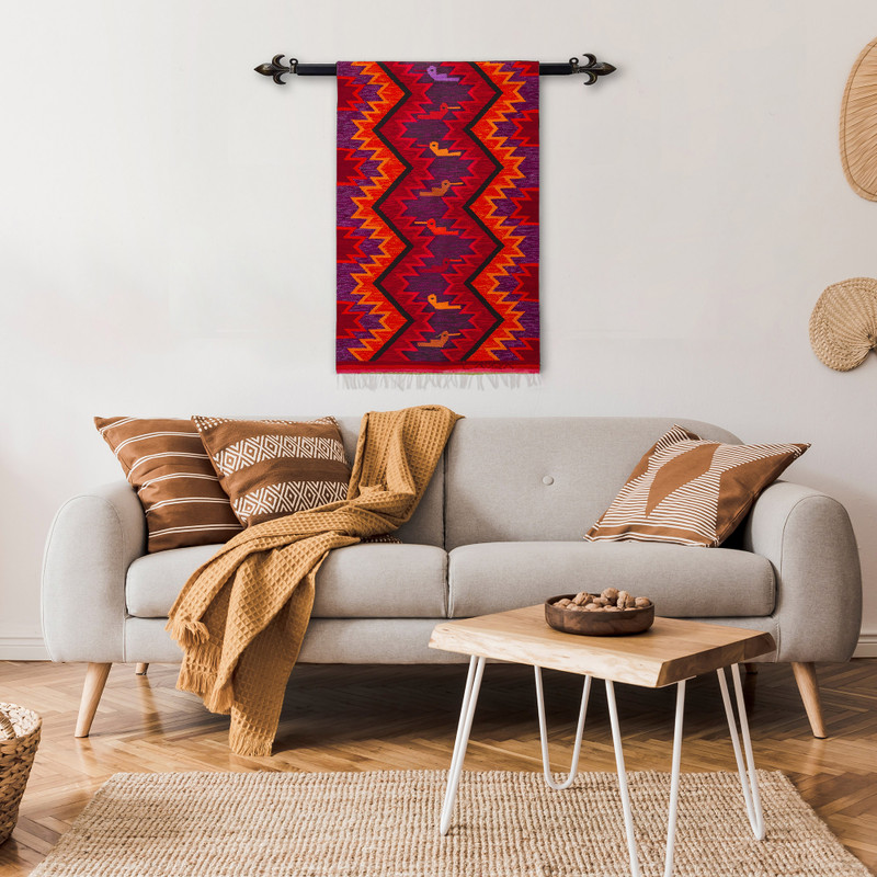 Carrying on the tradition of pre-Hispanic textiles, Peru's David Laura Zanabria creates this vibrant tapestry. He works on a traditional loom with wool to hand-weave this tapestry, which features a colorful geometric zigzag motif with hummingbird patterns. For the artist, hummingbirds carry a very powerful spiritual significance. White fringe dangles from the bottom of this tapestry.