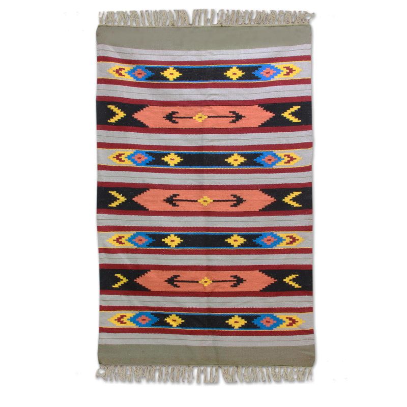 Stripes of crimson and eggshell cover the body of this area rug, punctuated by geometric motifs in pumpkin and maize, with olive borders. Handwoven from 100% wool, the rug is presented by Sonik Sethi, working with local Indian artisans to create a welcoming piece. The rug is finished with petite fringes on the ends.