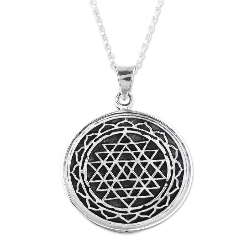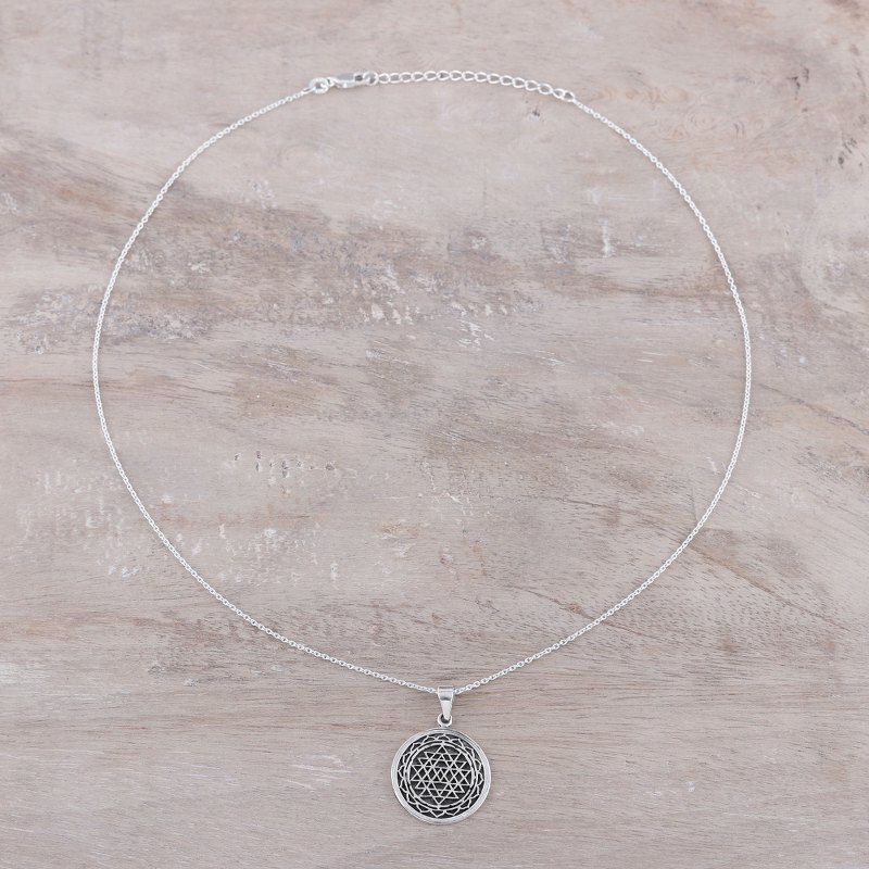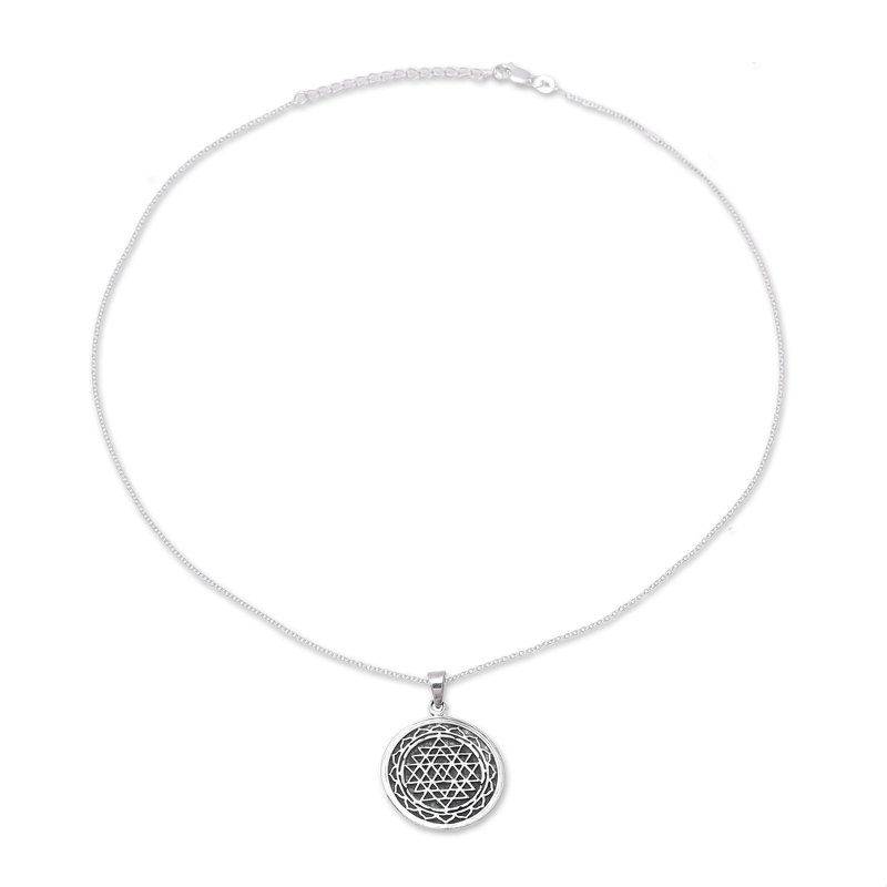 Intersecting triangles form a symbol for om, the soothing chant often used during meditation, in this sterling silver pendant necklace designed by Neetu Barathi of India. The round pendant is framed by a decorative ray motif followed by three narrow rings and hangs from a sterling silver cable chain that is adjustable in length.