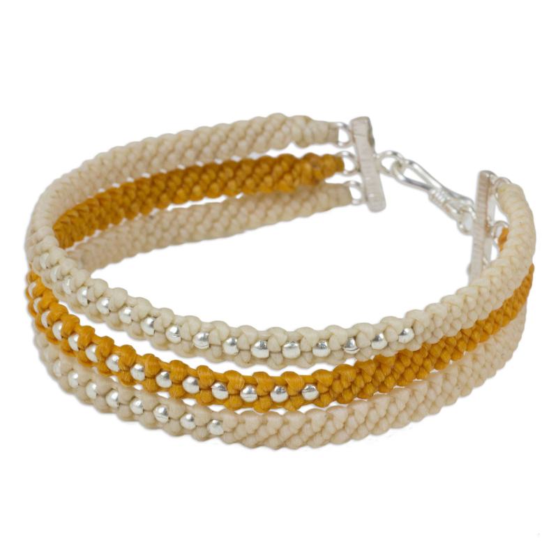 Knotted by hand on cords in orange-yellow and ivory, diminutive 950 silver beads reveal their innate shine. Napapat showcases the silver art of Thailand's Karen hill tribe in this beautiful and colorful macrame bracelet. It unites three separate cords with a sterling silver clasp.