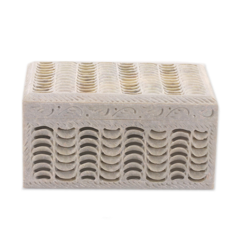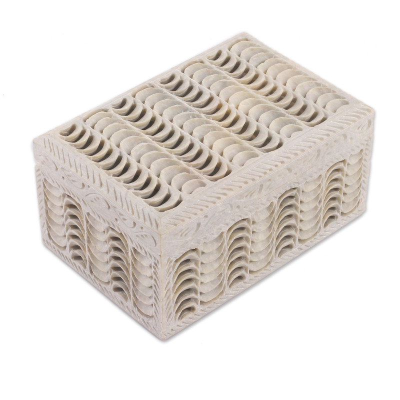 This eye-catching decorative box showcases the enduring artistry of Indian stone carving. From master artisan Gulam Rasool comes a natural soapstone creation adorned with a profusion of wavy motifs rendered in captivating jali openwork adorned with engraving details. This box offers a special place for your jewelry and other small valuables, where artistry and utility converge in a display of intricate beauty.