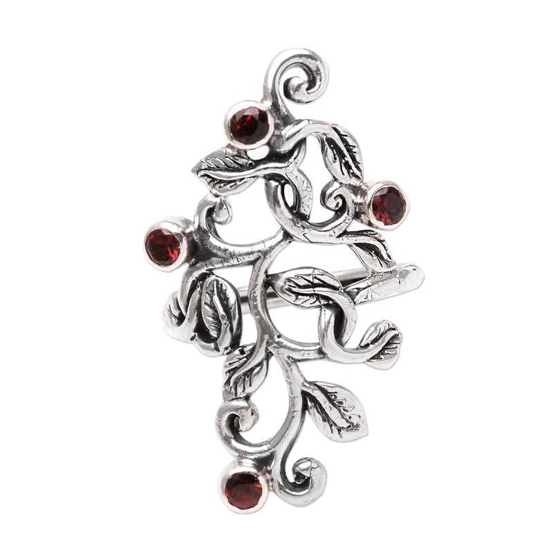 Sparkling crimson red garnets rest on this cocktail ring from Java. Designed by Rosalia Tarigan, it displays intricate openwork vine motifs, all crafted from sterling silver.