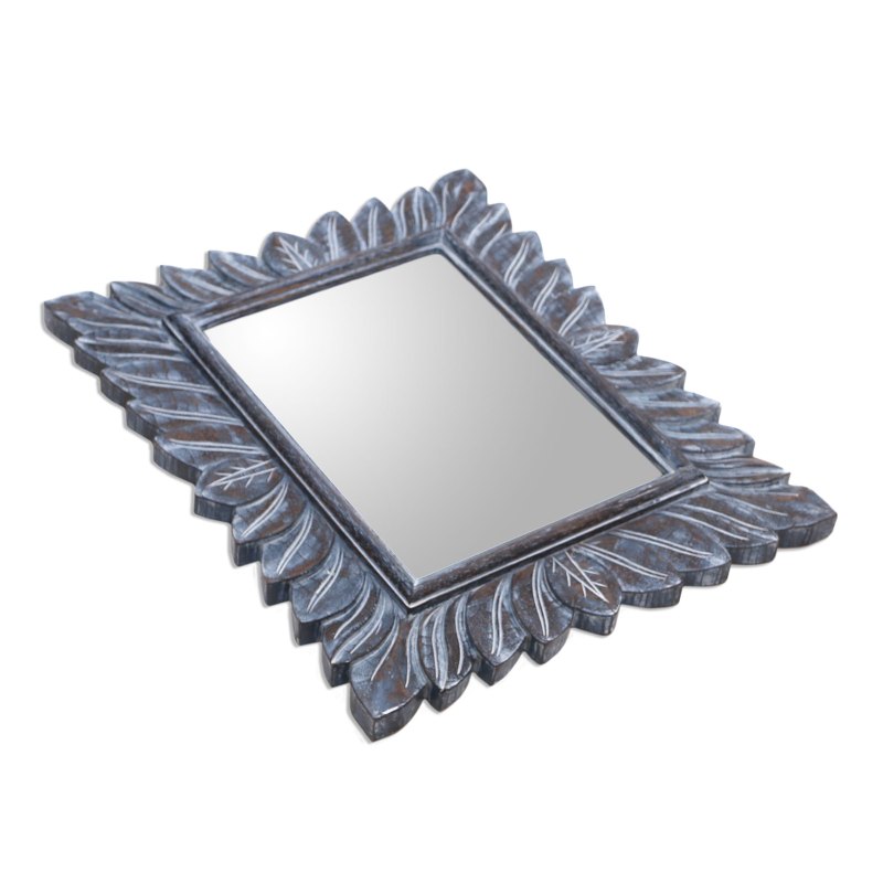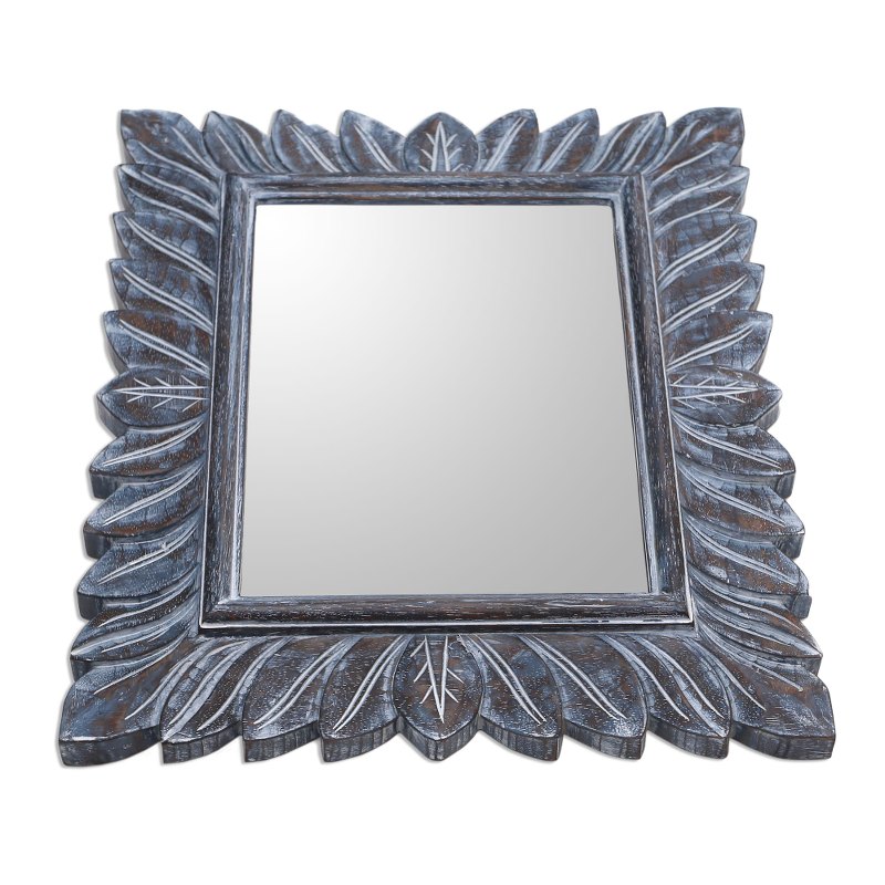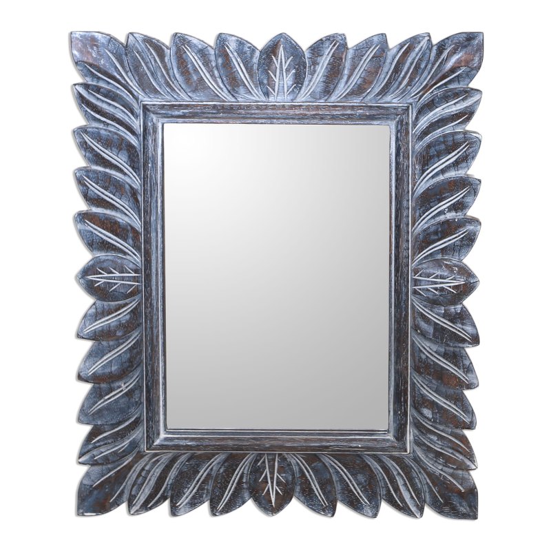 Inspired by the forests of the Plaga region in Bali, Dewa Semadi creates this elegant wall mirror. The frame is carved by hand from durian wood, revealing leafy patterns that are treated with a subtle white and blue wash.