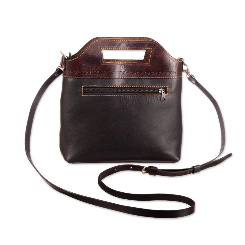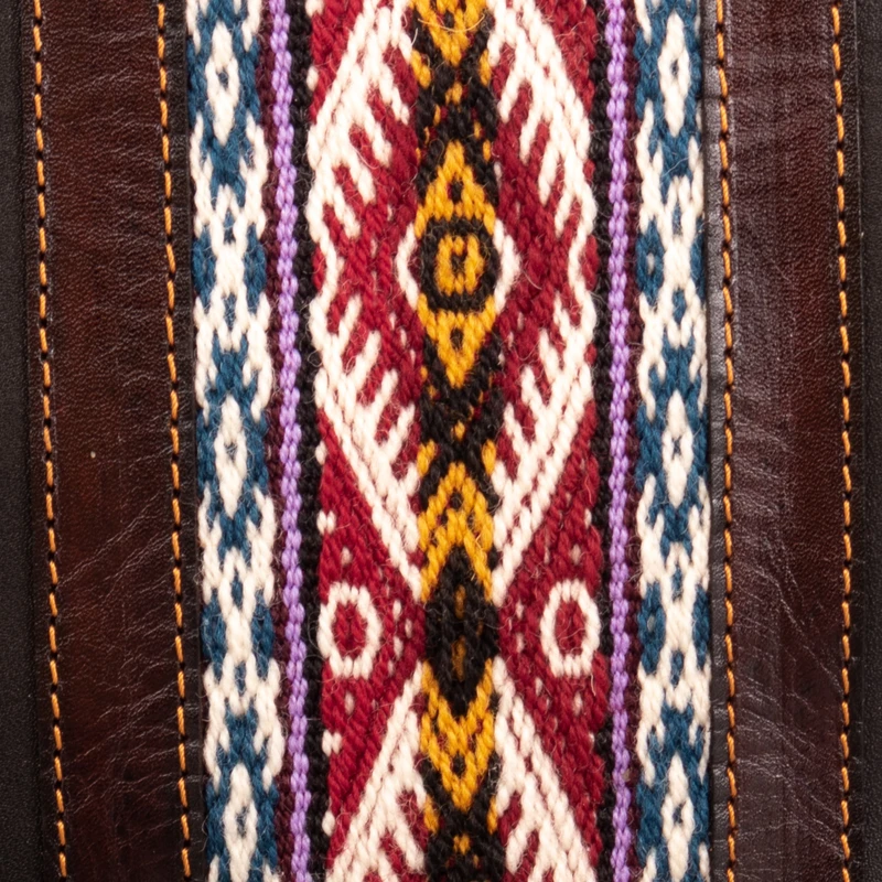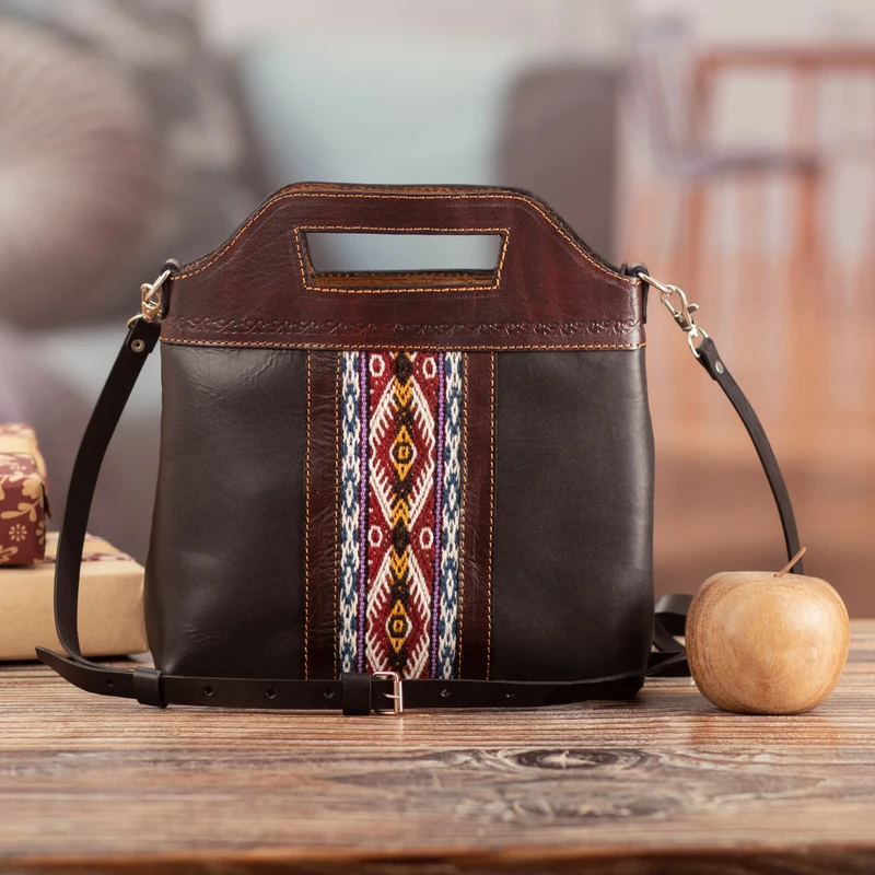 This chic sling bag offers versatility with its removable and adjustable strap, seamlessly transforming into a handle bag. Designed by Peruvian artisan Kathiana Quispe, it is meticulously fashioned from black and brown leather with petite embossed accents and a vibrant handwoven wool fabric inset adorned with traditional Inca motifs, adding a touch of cultural richness. Featuring a secure zippered closure, a fully lined interior and two convenient zippered pockets, this bag combines sophistication with practicality.