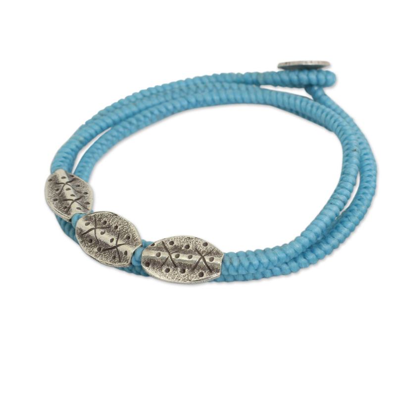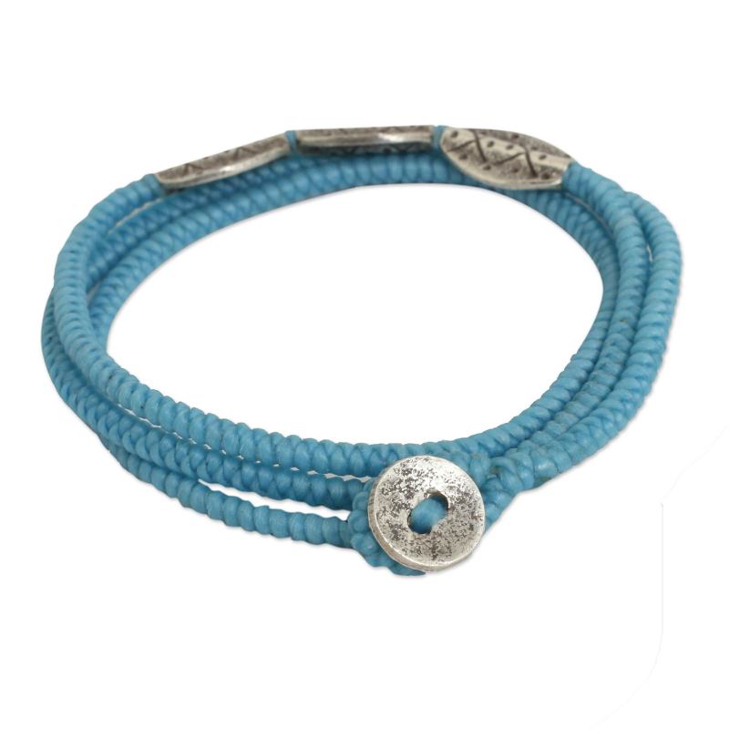 Artisan Napapat of Thailand presents a cord bracelet with minimalist hill tribe style. The sky blue cord bracelet wraps around the wrist and features Karen hill tribe oval silver beads with stamped patterns and an oxidized finish. The bracelet closes with a silver button.