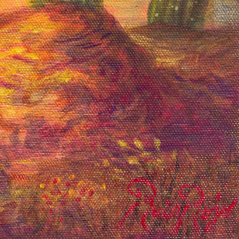 Replete with traditional Huichol imagery, this limited-edition giclée on canvas is a reproduction of Enrique Ruiz' original painting El Mara Kame, or 'The Shaman'. Fantastical creatures, suns, flowers and other figures fill the figure of the shaman, which looms large in a desert landscape. The Huichol or Wixárika are an indigenous group living in the states of Nayarit, Jalisco, Zacatecas, and Durango in Mexico.