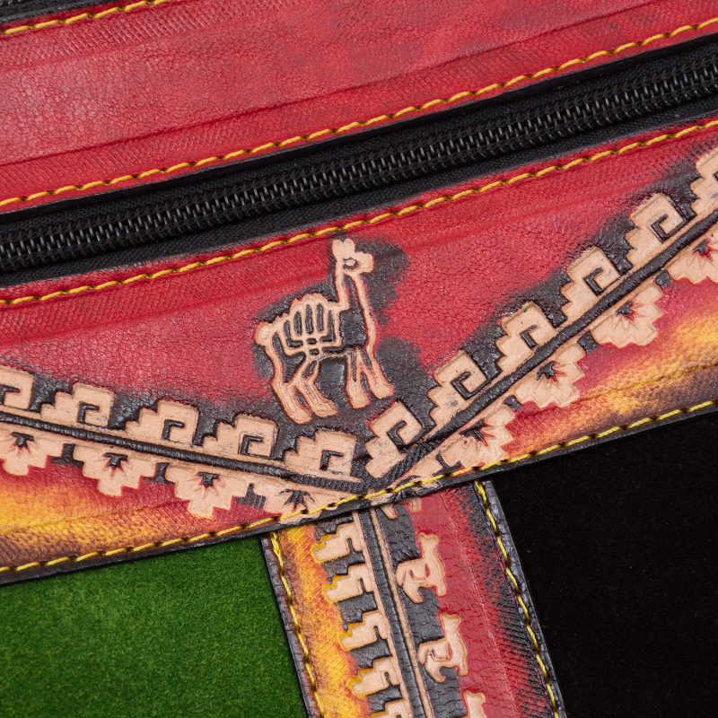 Kathiana Quispe of Peru designs this colorful leather and suede sling bag featuring an embossed llama and Incan motifs. Fully lined with a zip closure. Adjustable strap..