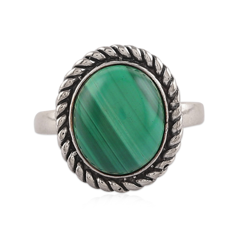A symphony of verdant greens dances across this statement cocktail ring where malachite's natural swirls and bold hue command attention against sterling silver. The vibrant stone sits proudly within an artfully crafted bezel, surrounded by delicate rope detailing that frames its organic patterns with sophisticated contrast. Presented by Chintan from India, this gorgeous accessory brings unexpected color and distinctive character to any ensemble.