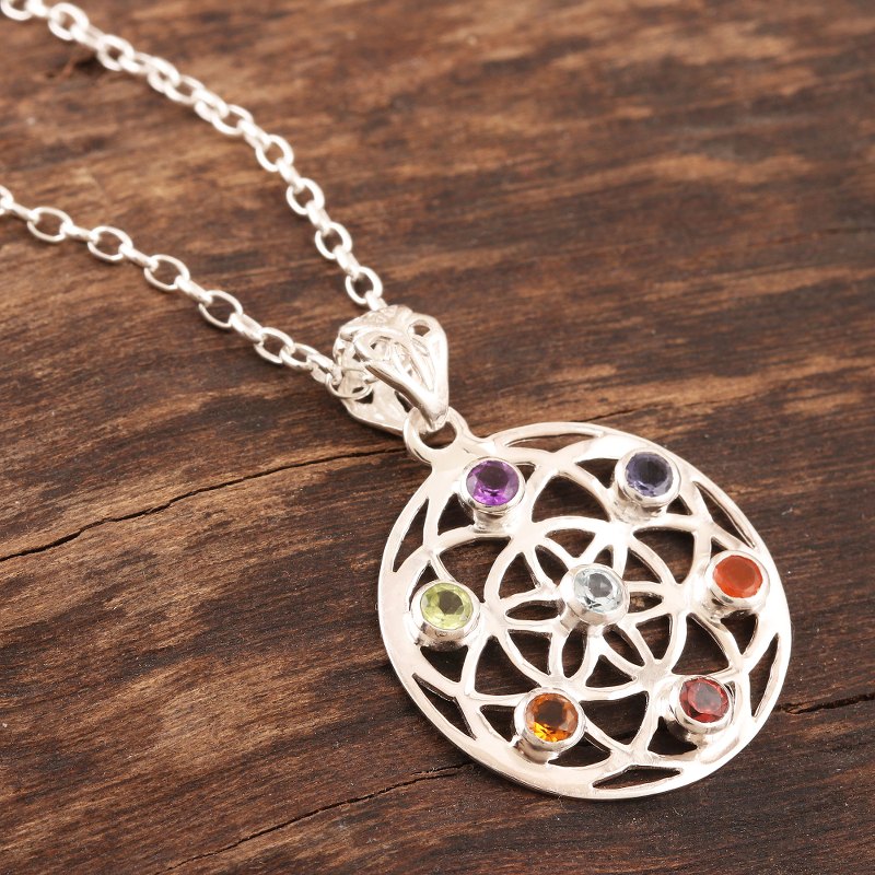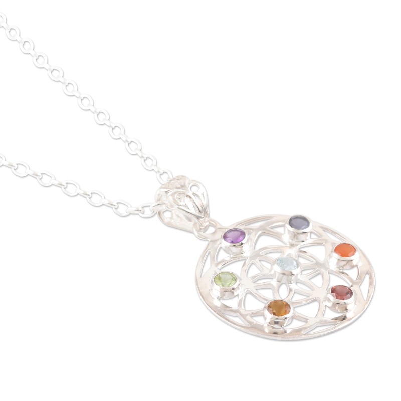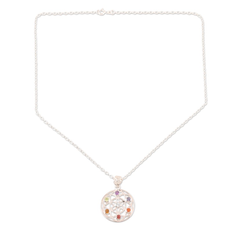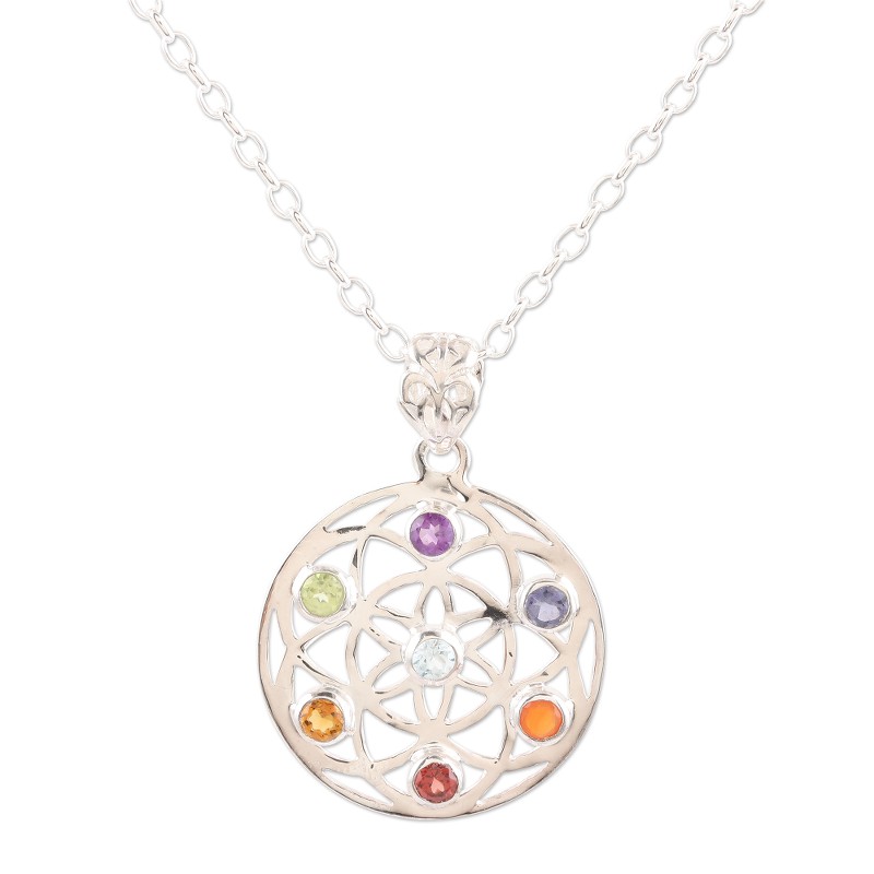 Attain peace of mind and channel positive energy wearing this fascinating pendant necklace from Alok Jain. A round blue topaz gemstone centers the openwork sterling silver pendant, which swings from a sleek cable chain. The pendant is studded with amethyst, carnelian, citrine, garnet, iolite, and peridot, each stone representing a different chakra point.