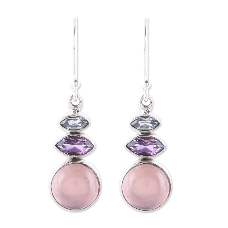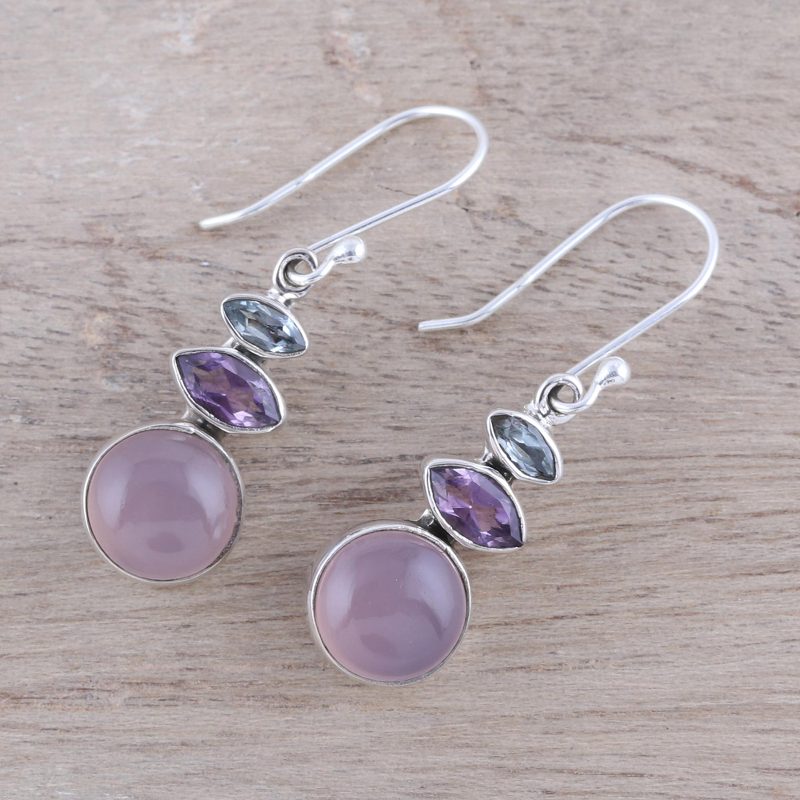 Bringing a peaceful vibe wherever it goes, this pair of dangle earrings is presented by India's Shanker, who works with local artisans. Each earring features marquise gems of amethyst and blue topaz that are displayed above a cabochon of pink chalcedony, framed by sterling silver.